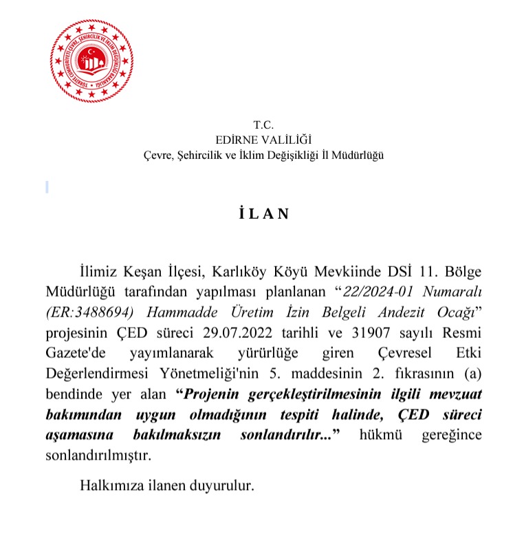İlgili Müdürlük tarafından yapılan duyuruda, ‘İlimiz Keşan ilçesi, Karlıköy Köyü Mevkiinde DSİ 11. Bölge Müdürlüğü tarafından yapılması planlanan ’22/2024-01 Numaralı (ER:3488694) Hammadde Üretim İzin Belgeli Andezit Ocağı” projesinin ÇED süreci 29.07.2022 tarihli ve 31907 sayılı Resmi Gazete’de yayımlanarak yürürlüğe giren Çevresel Etki Değerlendirmesi Yönetmeliği’nin 5. maddesinin 2. fikrasının (a) bendinde yer alan “Projenin gerçekleştirilmesinin ilgili mevzuat bakımından uygun olmadığının tespiti halinde, ÇED süreci aşamasına bakılmaksızın sonlandırılır…’ hükmü gereğince sonlandırılmıştır. Halkımıza ilanen duyurulur’ ifadelerine yer verilmiştir. Keşan Kent Konseyi olarak Kamuoyuna ve basınımıza saygıyla duyuruyoruz.”