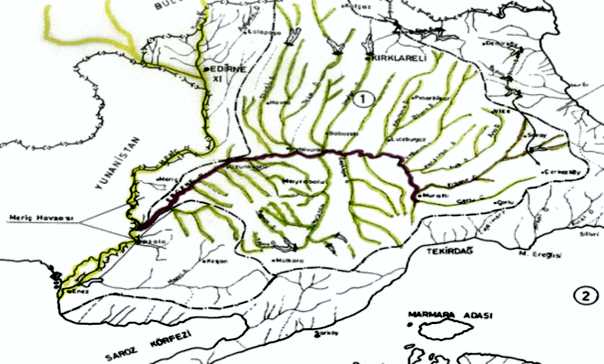 Aşağıda ki harita tüm Trakya’yı drene eden pembe renkle gösterilen Ergene Nehrinin kolları olan tüm dereler gösterilmiştir.