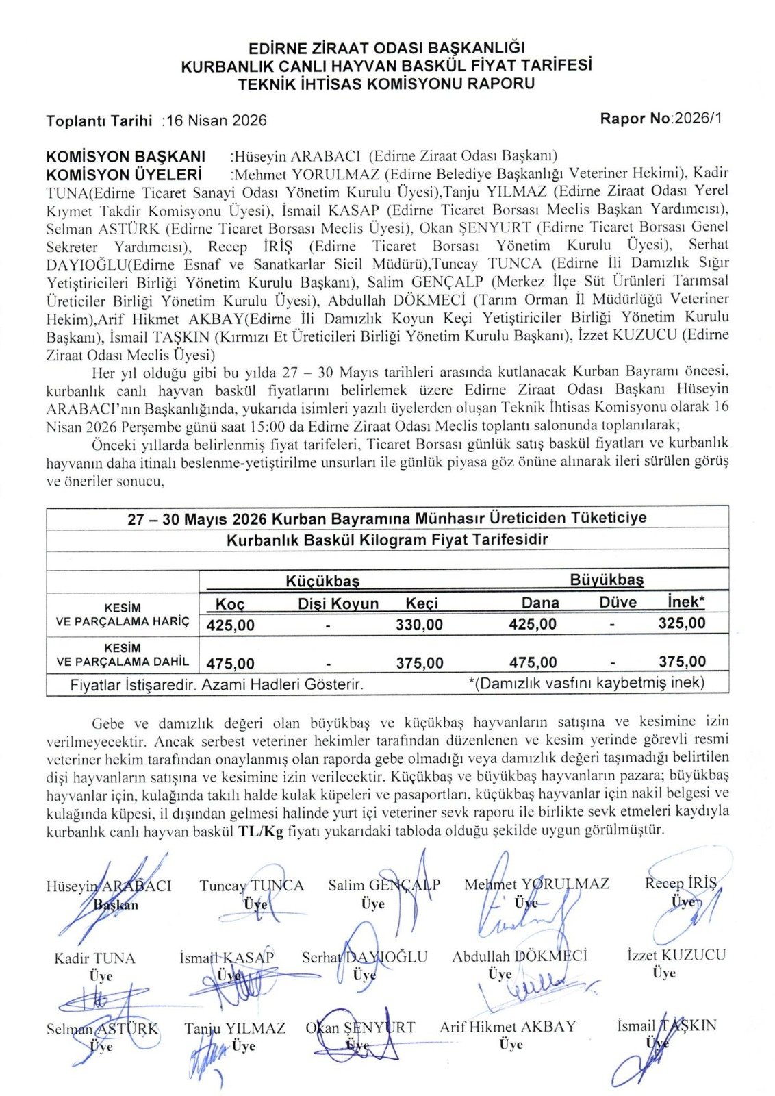 Bu yıl 27-30 Mayıs tarihleri arasında kutlanacak Kurban Bayramı öncesi, Edirne Ziraat Odası Başkanlığı’nda toplanan, oda, borsa, tarım il müdürlüğü ve belediyeden temsilcilerin oluşturduğu teknik ihtisas komisyonu, kurbanlık canlı hayvan baskül fiyatlarını belirledi.