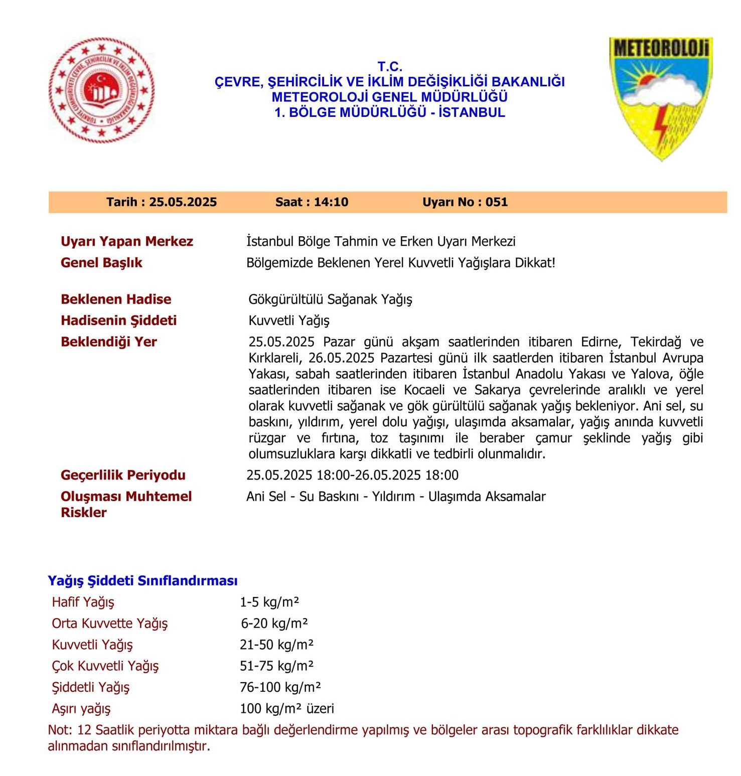 “25.05.2025 Pazar günü akşam saatlerinden itibaren Edirne, Tekirdağ, Kırklareli ve Çanakkale, 26.05.2025 Pazartesi günü ilk saatlerden itibaren İstanbul, Yalova, Balıkesir, Bursa, İzmir ve Manisa, öğle saatlerinden itibaren Kocaeli, Sakarya ve Bilecik çevrelerinde aralıklı ve yerel olarak kuvvetli sağanak ve gök gürültülü sağanak yağış bekleniyor. Ani sel, su baskını, yıldırım, yerel dolu yağışı, ulaşımda aksamalar, yağış anında kuvvetli rüzgar ve fırtına, toz taşınımı ile beraber çamur şeklinde yağış gibi olumsuzluklara karşı dikkatli ve tedbirli olunmalıdır.”