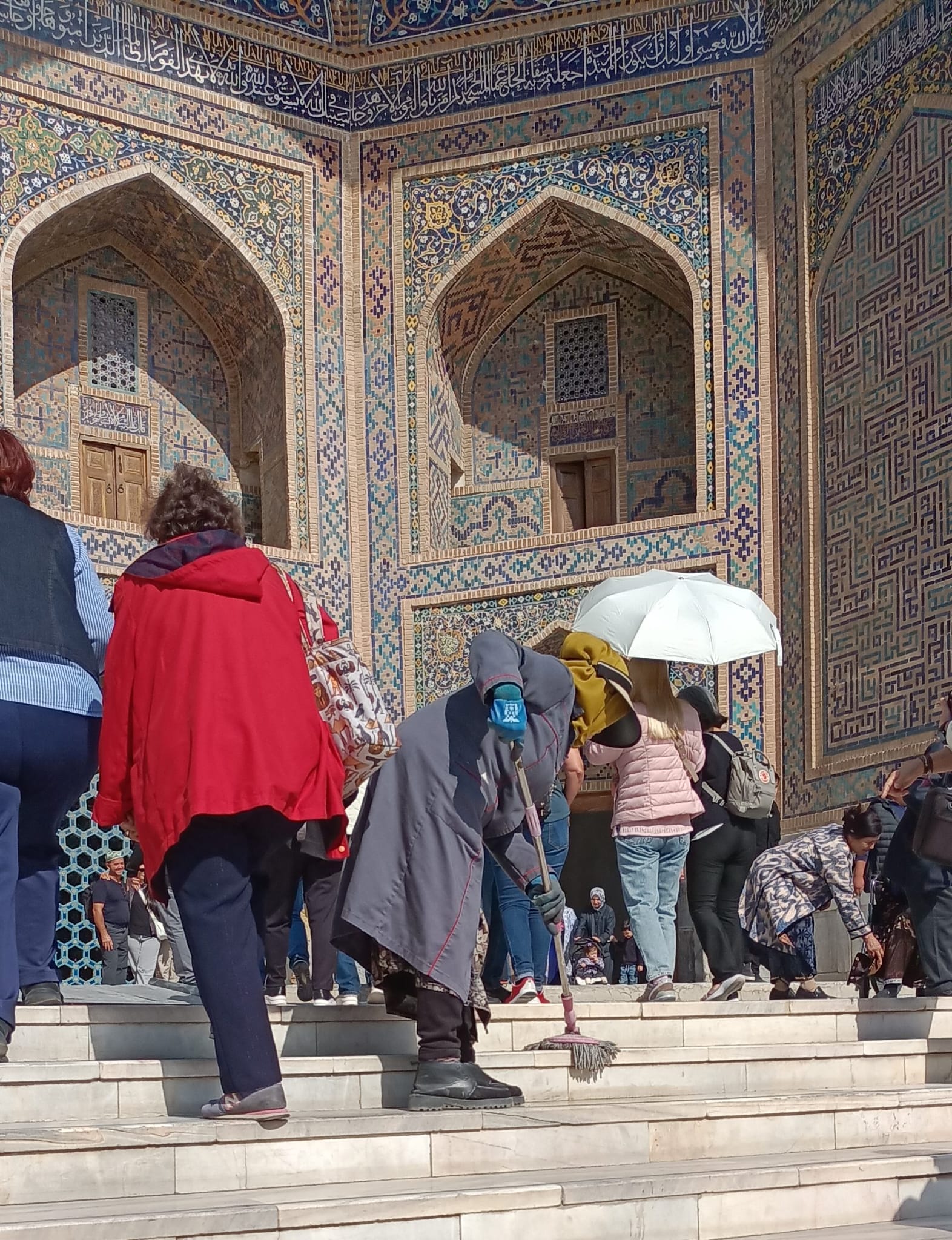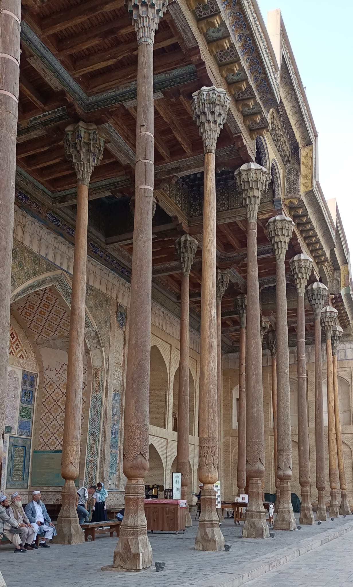 Türbenin ardından, insanı ilk bakışta çarpan görüntüsüyle Bolo Haouz Camisi yeni durağımız oluyor. O zarif, incecik oymalı ahşap sütunlar ve namaz vaktini bekleyen yerel kıyafetli insanların oluşturduğu tabloyu, fotoğraf karelerine sığdırmaya doyamıyorum. Buhara şehriyle birlikte UNESCO Dünya Mirası Listesi’nde yer alan tarihi Cami, 1712 yılında yapılmış. Buhara Registan bölgesindeki Ark kalesinin karşı tarafında inşa edilen eser; şehrin ve Buhara Emirinin 1920’lerde Bolşevik Rus yönetimi tarafından boyunduruk altına alındığı dönemde Cuma Camisi olarak hizmet vermiş.