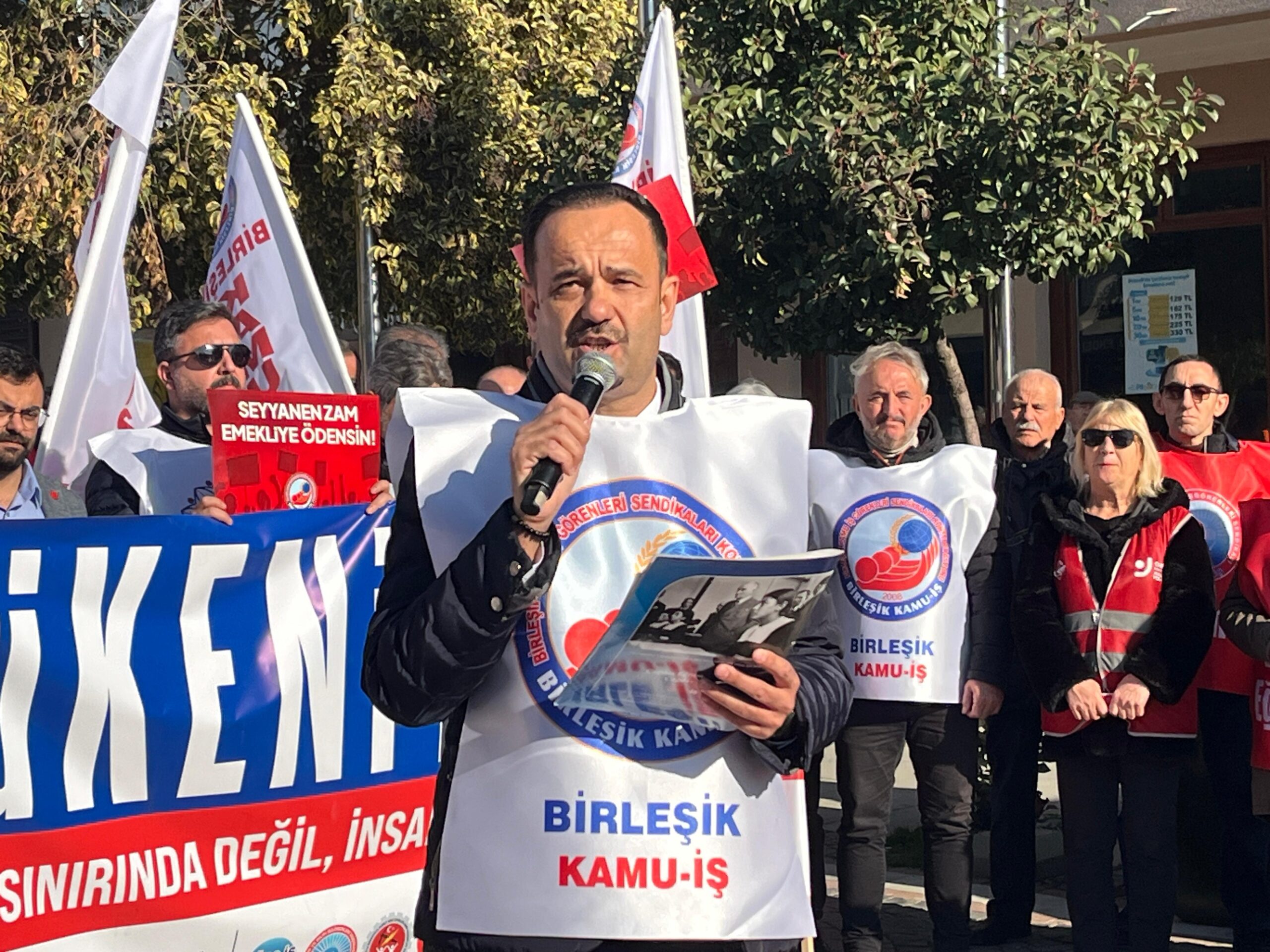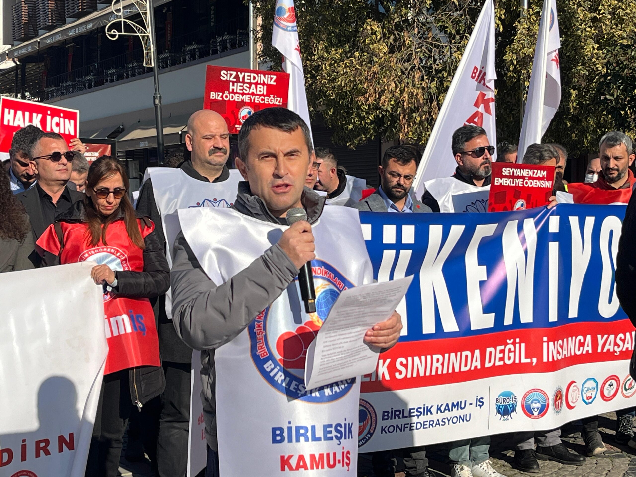 Açıklamaya devam eden Birleşik Kamu-İş Merkez Yönetim Kurulu Üyesi Mehmet Koç da, hazırlanan 2026 bütçesinde halkın olmadığını söyleyerek, “Bütçe’de hak yok, halk yok, işçi sınıfı yok, matematik yok, vicdan yok. Sermaye var, yandaşların çıkarları var, zenginin ağzına çalınan parmak parmak ballar var. Bütçenin yükü dolaylı vergilerle zaten yoksulluktan beli bükülmüş emekçi ve açlık sınırının bile altına atılmış emeklilerin sırtına bindirilirken kamu kaynakları sermaye gruplarına aktarılıyor. Sosyal devlet ilkesi görmezden gelinerek hazırlanan bütçede, halkın refahını gözeten en ufak bir hamle yok. En zenginlerin sırtı kamu teşvikleri ve vergi sıfırlamalarıyla sıvazlanırken, bu bütçeye göre halk yine en çok vergiyi ödeyip yine en az hizmeti alacak. Oysa halkın vergileri şirketlerin kâr hanesine değil, yurttaşların ihtiyaçlarına ayrılmalıdır. Bütçe, halkın ortak kaynağıdır. Bu kaynaktan en büyük pay emekçiler, emekliler, gençler ve engelliler başta olmak üzere yoksul halkımızın tamamına ayrılmalıdır. Bütçe, ekonomi gemisinin rotasıdır; rotası adil ve bilimsel şekilde belirlenmeyen bu geminin daha da derin ekonomik krizlerin kıyısına vuracağı ne yazık ki gün gibi ortadadır” şeklinde konuştu.