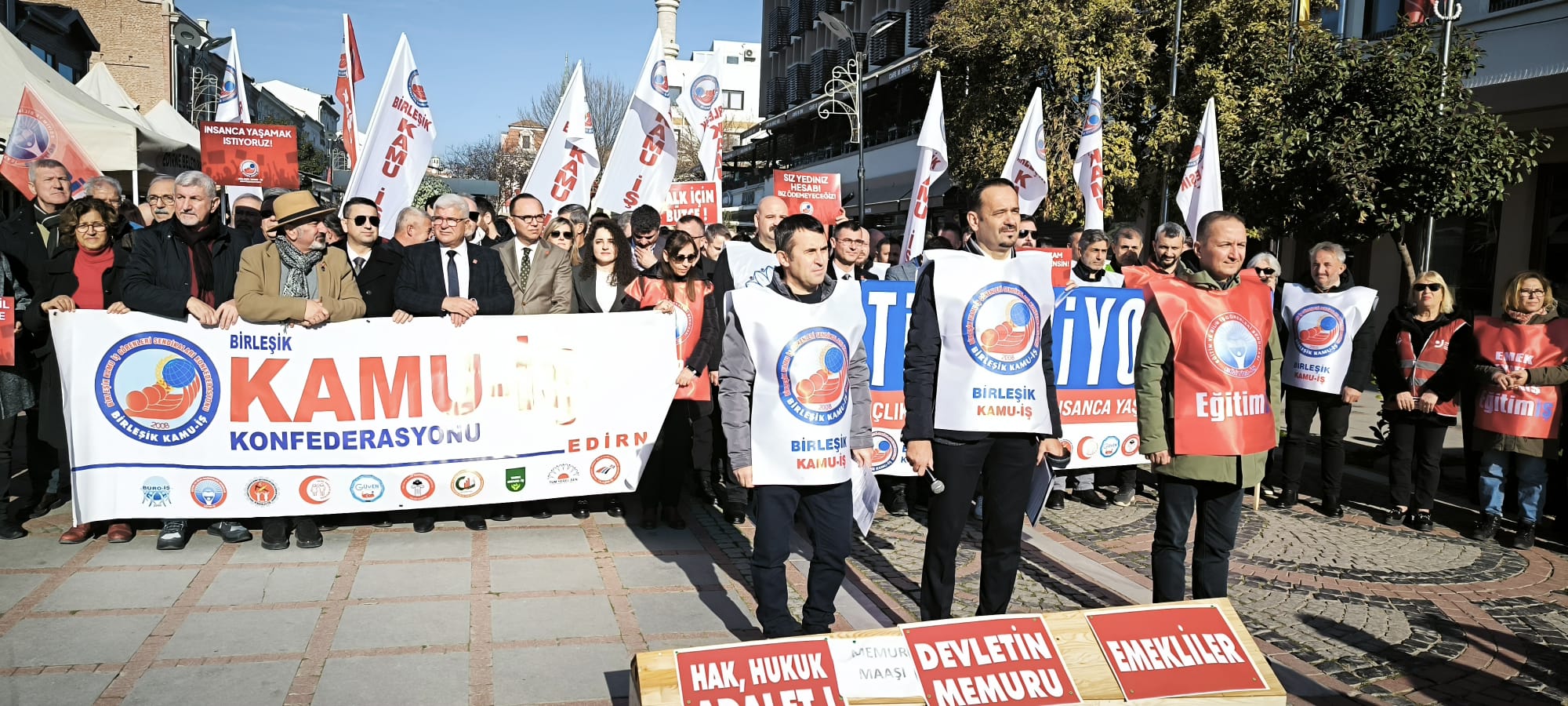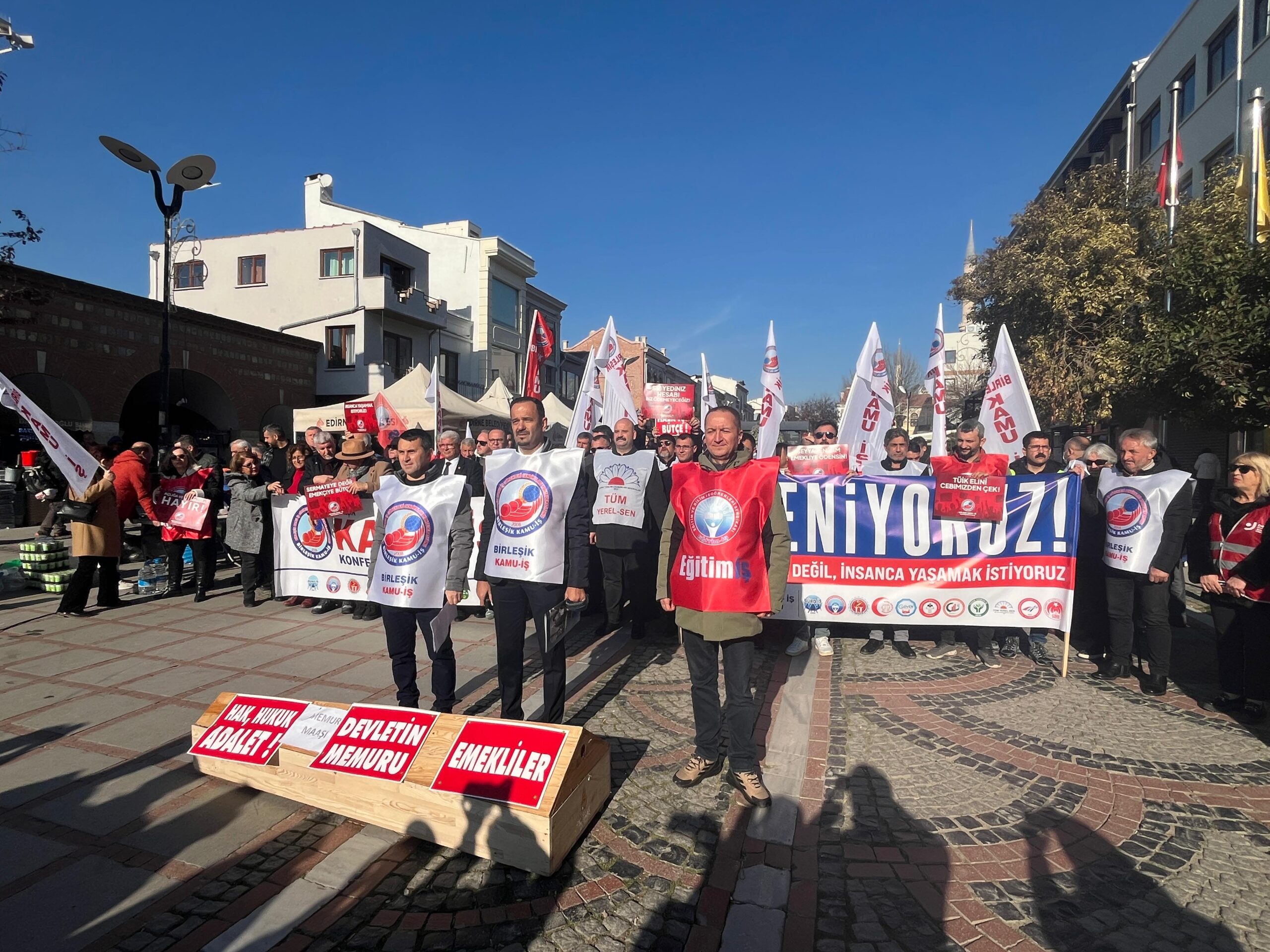 Birleşik Kamu-İş Konfederasyonu’na bağlı sendikalar, iktidarın emekçiyi yoksullaştıran, sermayeyi koruyan ekonomi politikalarına karşı; insanca yaşam, adil ücret ve hakça paylaşım talebiyle ülke genelinde iş bıraktı. Edirne’de de iş bırakan konfederasyona bağlı sendika temsilcilerinin katılımıyla, Saraçlar Caddesi’nde basın açıklaması gerçekleştirildi. Açıklamaya siyasi parti ve sivil toplum kuruluşu temsilcileri de destek verdi.