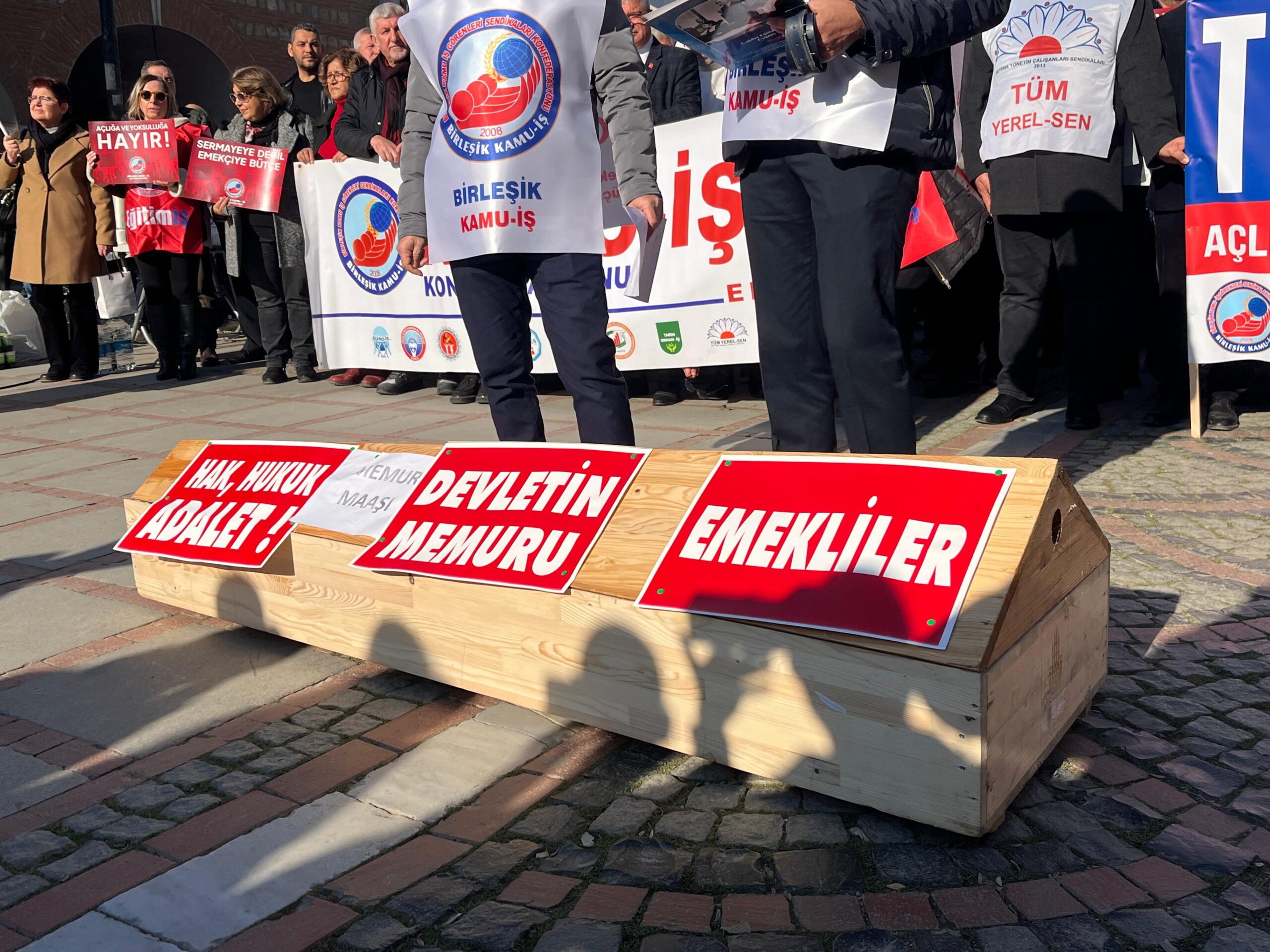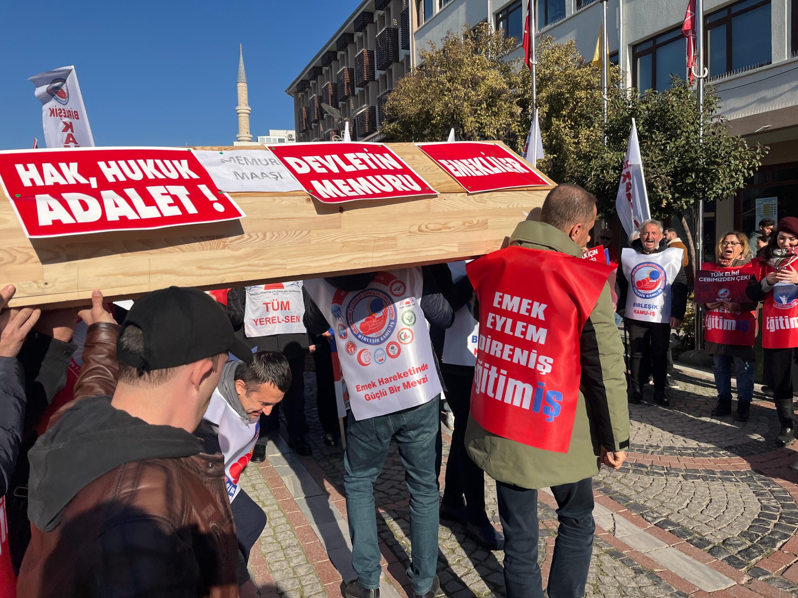 Basın açıklamasında, memur ve emekliye 2026 bütçesinde yeteri kadar pay ayrılmadığı gerekçesiyle temsili olarak tabut getirildi. Tabutun üzerinde ‘Devletin Memuru’, ‘Emekliler’ ve ‘Memur Maaşı’ yazıları asılarak, artık çalışanların dayanacak gücü kalmadığı ifade edildi. Açıklamanın sonunda sendika temsilcileri, tabutu temsili olarak sırtlayarak götürdü.