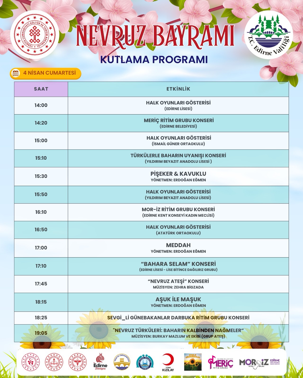 Edirne’de Kültür ve Turizm İl Müdürlüğü tarafından, 4 Nisan Cumartesi günü, Söğütlük Millet Bahçesi’nde gerçekleştirilecek etkinliklerle, Nevruz Bayramı kutlanacak.