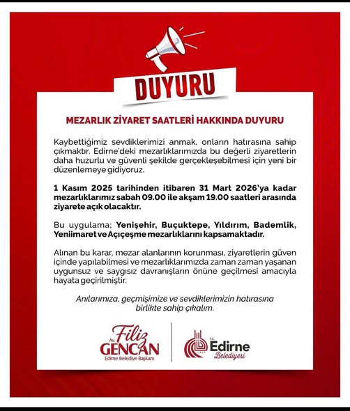 Edirne Belediye Başkanlığı, kentteki mezarlıkların 09.00 – 19.00 saatleri arasında ziyarete açık olacağını duyurdu.