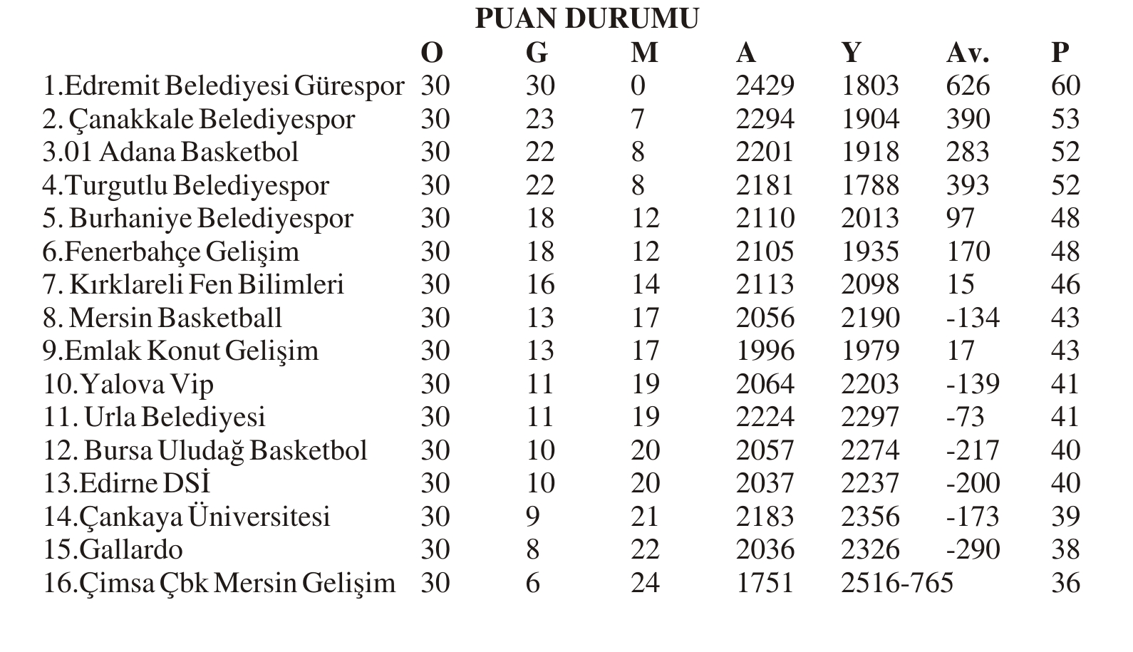 TKBL’DE 30. HAFTA TOPLU SONUÇLAR