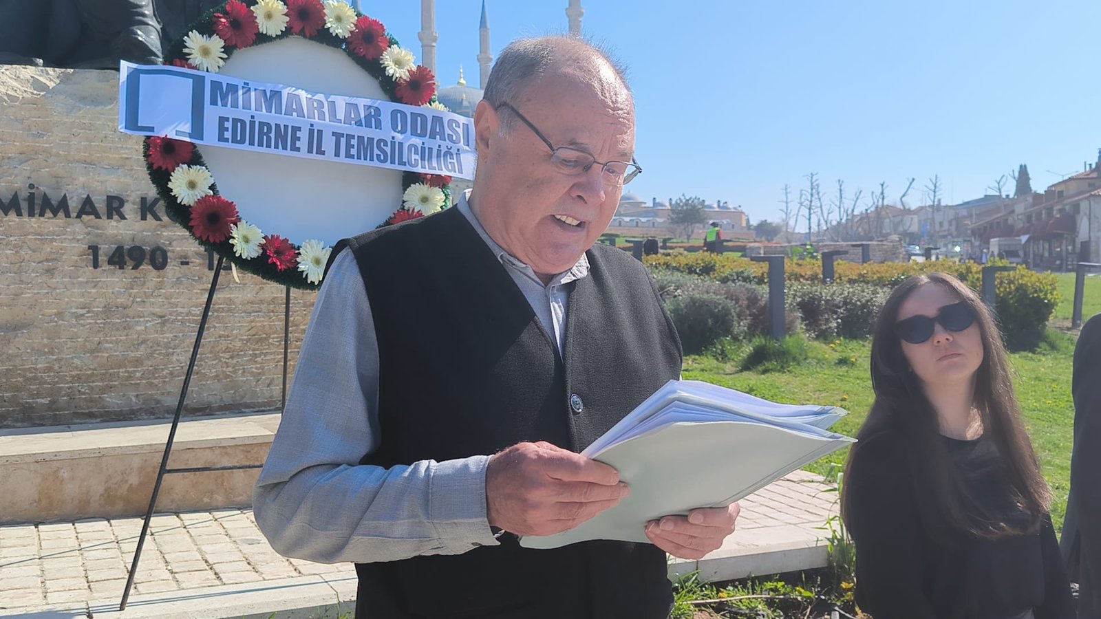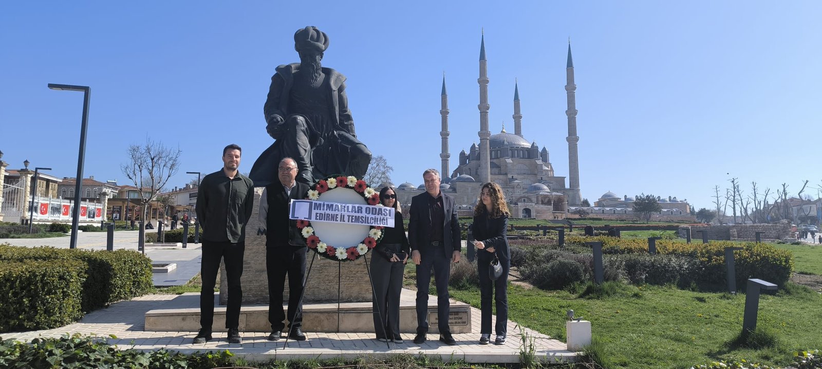 Mimar Sinan Anıtı önünde toplanan Mimarlar Odası Edirne Temsilciliği üyeleri, anıta çelenk sunduktan sonra saygı duruşunda bulundu. Başkan Attila Ergin, “Bugün burada, yalnızca büyük bir mimarı anmak için değil; bir medeniyetin estetik, akıl ve ustalıkla nasıl inşa edildiğini yeniden hatırlamak için bir araya geldik.  Mimar Sinan’ı anmak, aslında taşın dile geldiği, ölçünün sanata dönüştüğü ve insanın doğayla uyum içinde var olduğu bir anlayışı yeniden düşünmektir dedi.