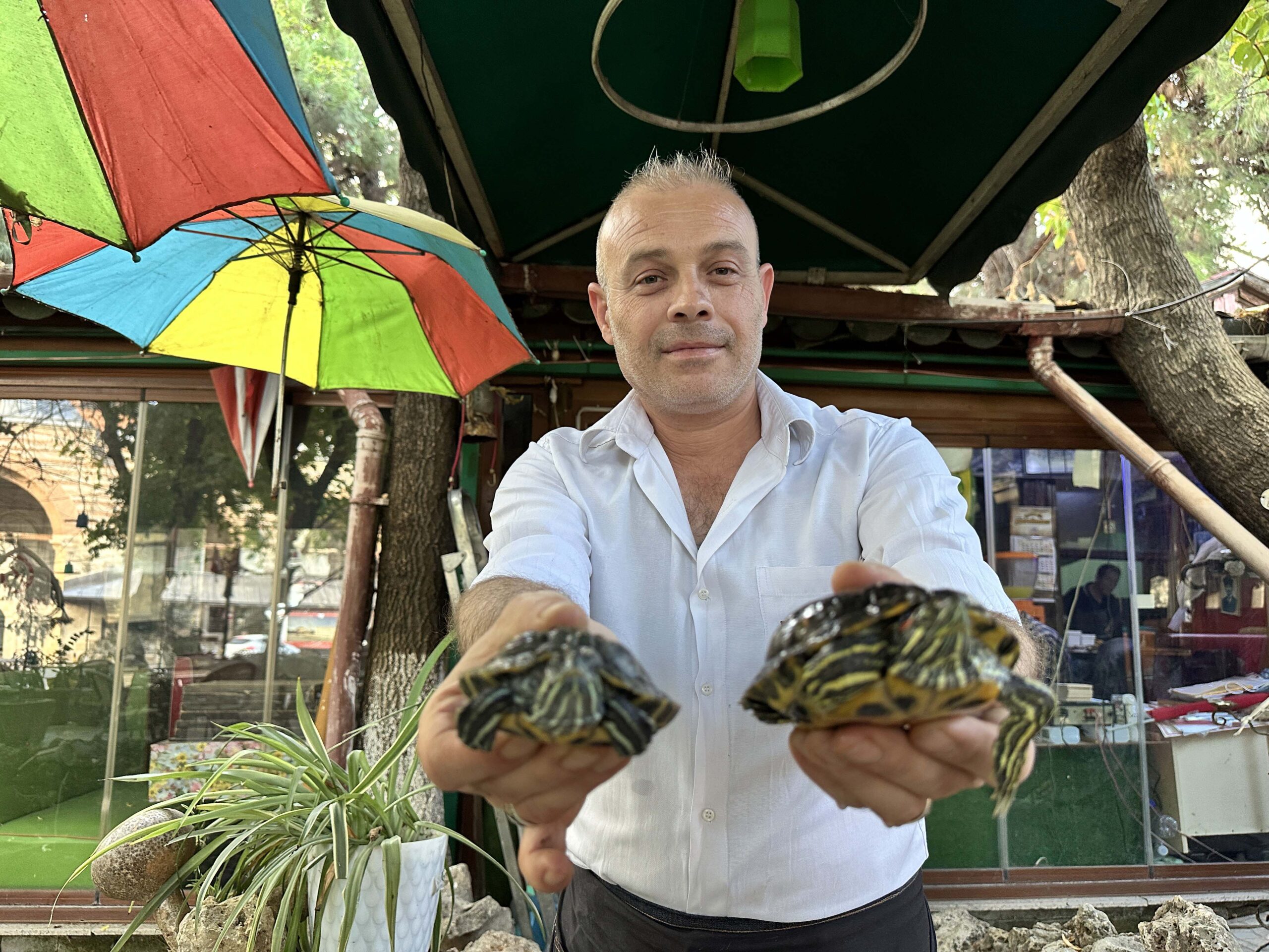 Kaplumbağaların mikrop taşımayan, sorunsuz hayvan olduğunu söyleyen Tunca, “Mikrop taşımayan bir hayvan. Gelen müşterilerimizin çocuklarının da hoşuna gidiyor. Buraya gelen müşterilerimiz fotoğraflarını çekip sosyal medyalarında paylaşıyorlar. Bizler memnunuz, 18 tane kaplumbağamız var. Bakımları biraz zor ama eğlenceli. Mesela ciğeri çok seviyorlar. Ben karpuz kabuğu getiriyorum atıyorum onlara. Ciğer yiyorlar, karpuz ve kavun kabuklarını atıyoruz. Et, domates ve salatalık kabuğu seviyorlar. Alıştık, biz de müşteriler de memnun. 15 senedir burada bizimle beraber yaşıyorlar. Yani evde bakamayan bana getiriyor, bakımevi gibi olduk” dedi.