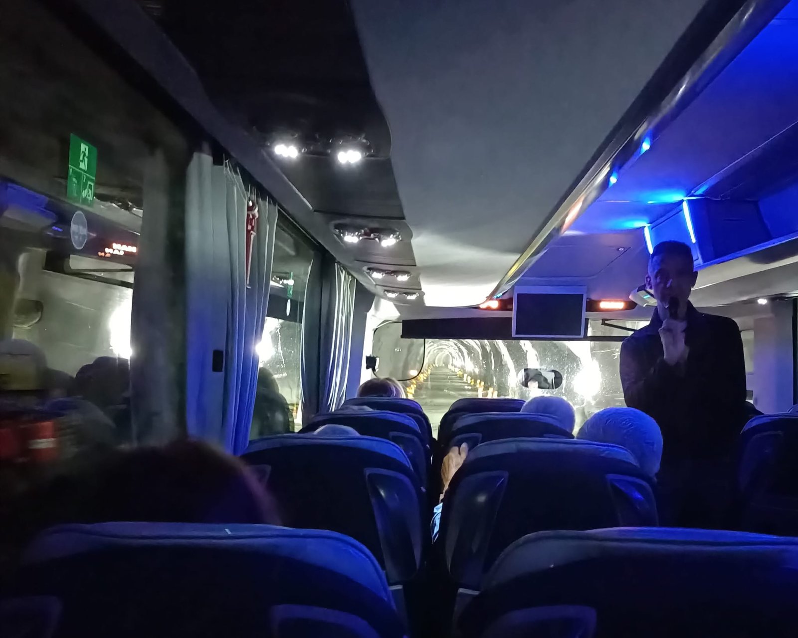 Otobüsümüz tünelde, rehberi dinliyoruz