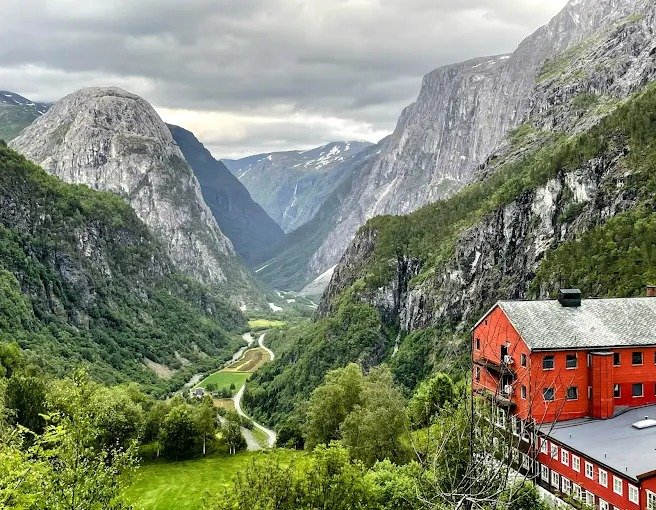 Şelaleden sonra ilginç bir görüntü veren UNESCO Dünya Miras Listesindeki Stalheim Hotel’i görmek için yola devam ediyoruz. Vadi tabanından 500 metre yükseklikte, dik bir uçurumun kenarında eşsiz bir konuma sahip olan otel, yolun ve UNESCO Dünya Mirası Listesi’nde yer alan Nærøydalen vadisinde, 13 keskin virajdan oluşan, yolun en üstünde yer alıyor.