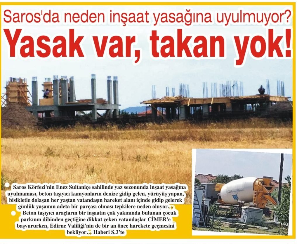 Hudut Gazetesi’nin 21 Temmuz 2025 Pazartesi günkü nüshasında “Saros’da neden inşaat yasağına uyulmuyor? Yasak var, takan yok!” başlıklı haberinde şunlara yer verilmişti: