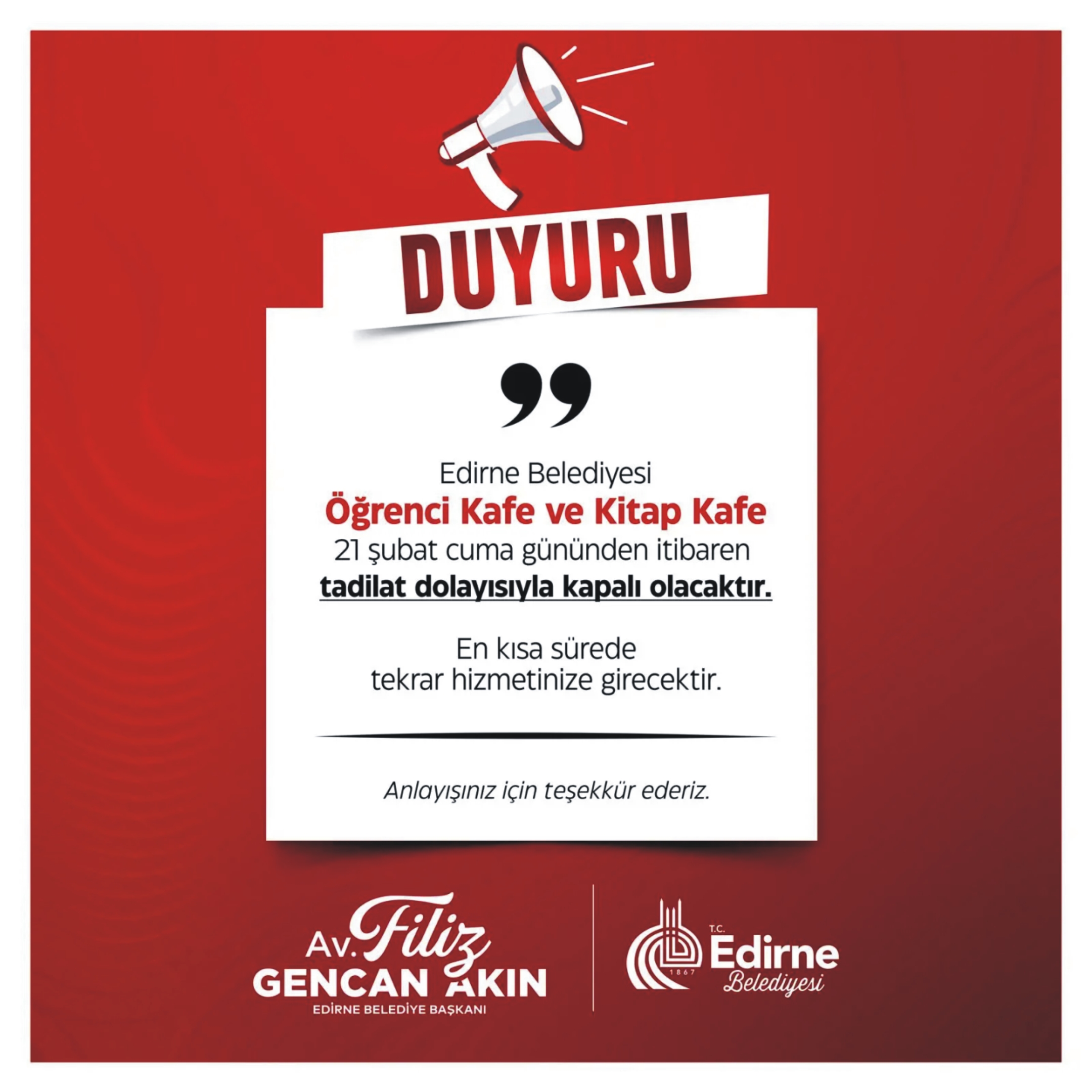 Edirne Belediyesi tarafından işletilen Öğrenci Kafe ve Kitap Kafe, vatandaşlara daha konforlu ve modern bir ortam sunmak amacıyla tadilata alınıyor. 21 Şubat Cuma gününden itibaren geçici olarak kapalı olacak bu iki mekân, yenileme çalışmalarının tamamlanmasının ardından yeniden hizmet vermeye başlayacak.