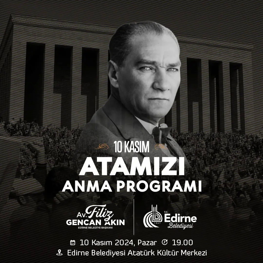 Türkiye Cumhuriyeti’nin Kurucusu Gazi Mustafa Kemal Atatürk, ebediyete intikalinin 86. yıl dönümünde yarın bir kez daha saygı, şükran ve minnetle anılacak. Edirne’deki anma programı yarın sabah Atatürk Anıtı önünde başlayacak. Saat 08.55’de Atatürk Anıtı önünde çelenk sunma töreni gerçekleştirilecek. Saat 09.20’de Belediye Binasındaki Atatürk Odası ziyaret edilecek. Saat 10.00’da da Halk Eğitimi Merkezi Müdürlüğü Mimar Kemaleddin Çok Amaçlı Kültür ve Tiyatro Salonu’nda Anma Programı uygulanacak.