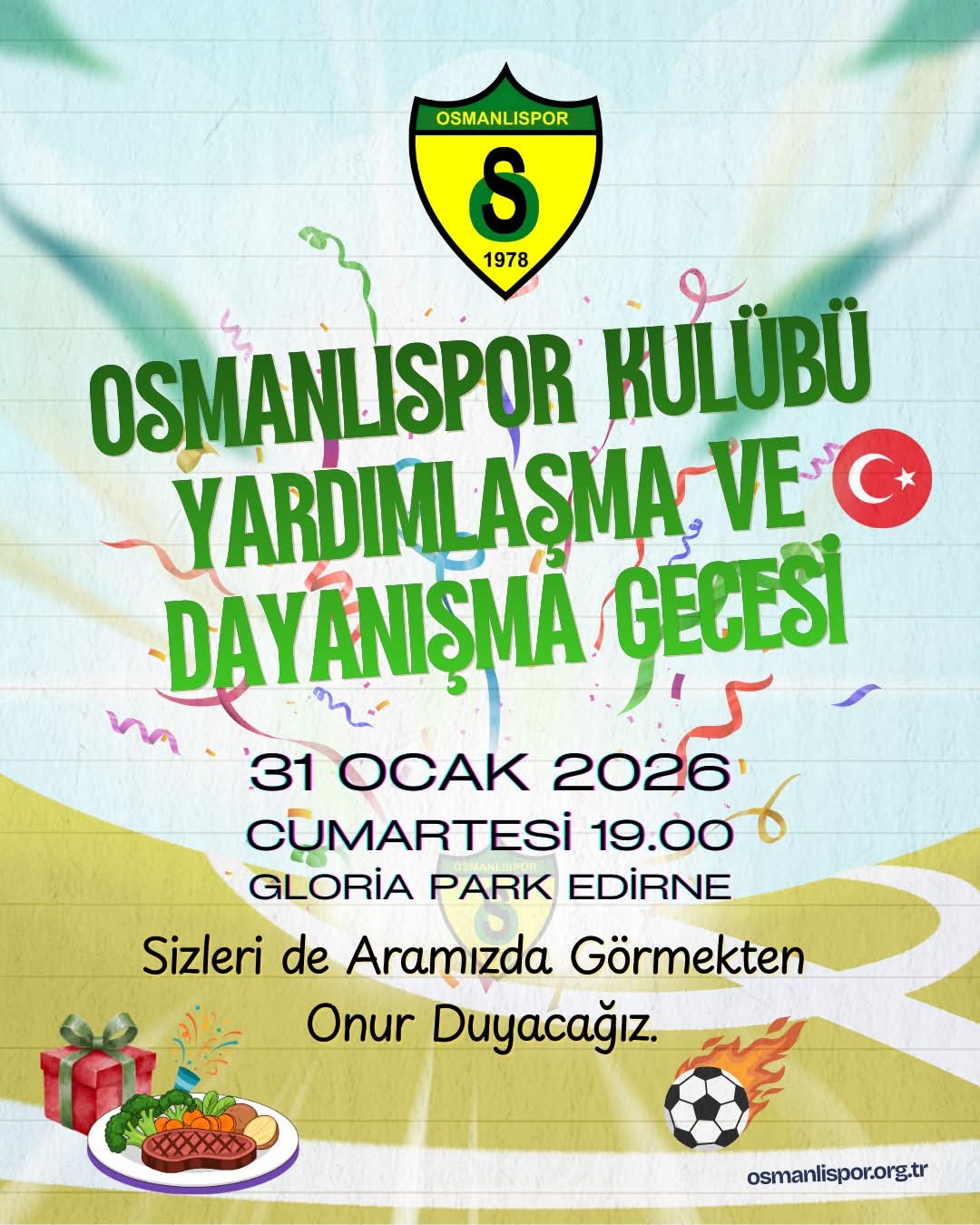 Edirne’de Süper Amatör Lig’in başarılı temsilcilerinden Osmanlıspor Kulübü, 31 Ocak’ta gerçekleştirilecek Yardımlaşma ve Dayanışma Gecesi’yle taraftarlarını bir araya getirecek.