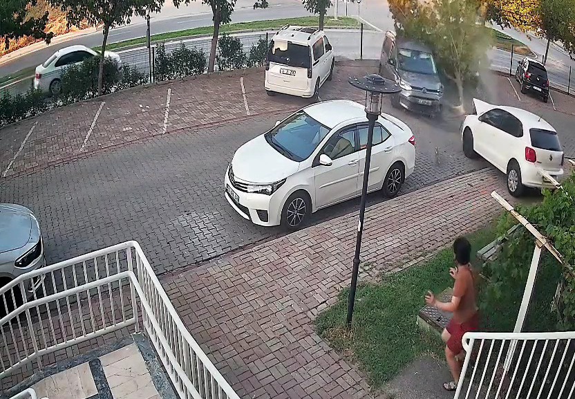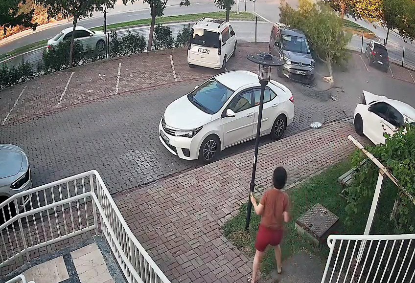 Kontrolden çıkan araç yol kenarındaki sitenin çitlerine, ardından bahçesindeki ağaca ve park halindeki otomobile çarparak durdu. Araçta ve otomobilde hasar oluşan kaza anı, sitenin güvenlik kamerasına yansıdı.