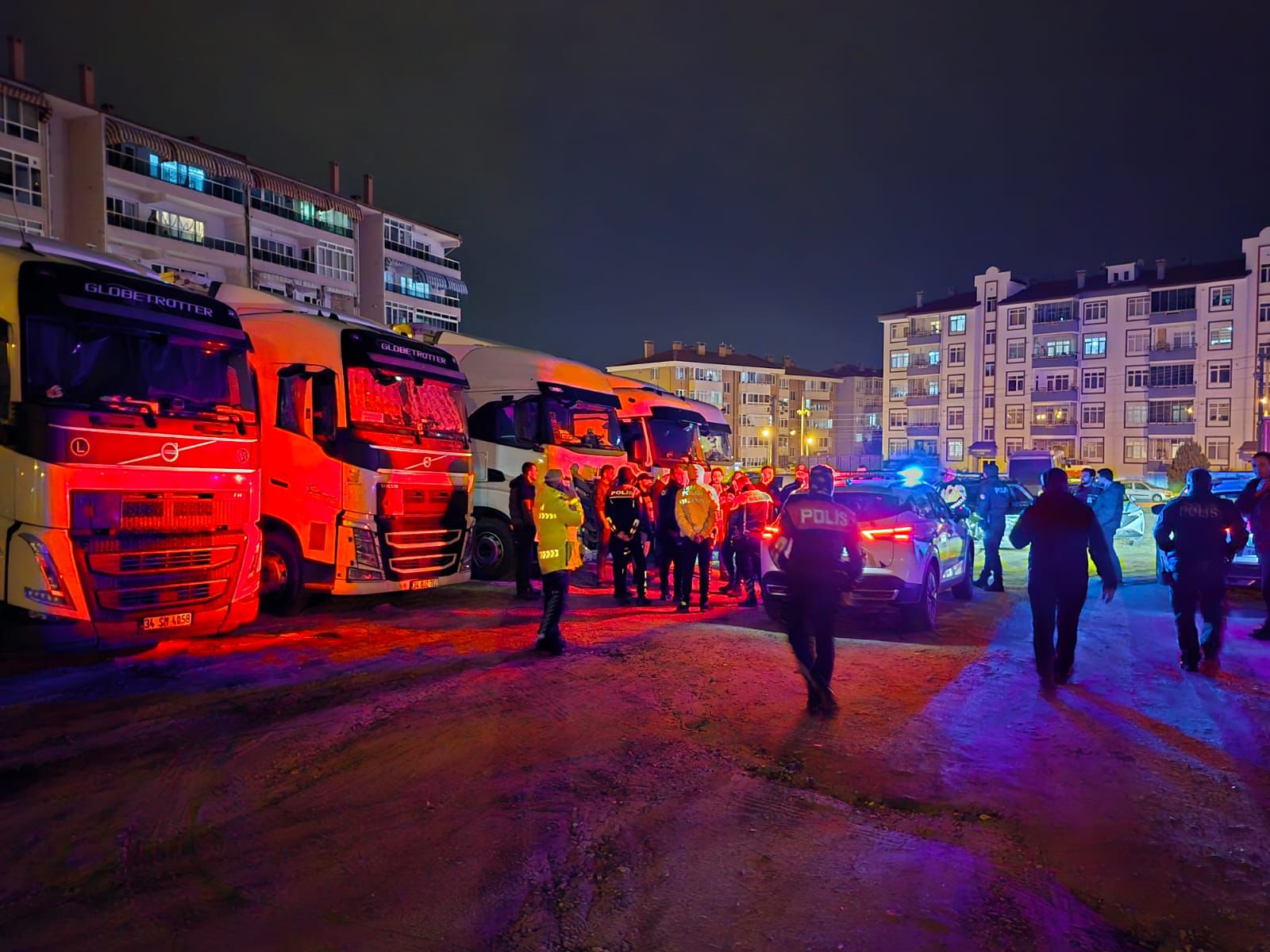 Kent merkezine girişleri yasak olan iki TIR’ın, Ümran Akkan Caddesi’ndeki boş araziye park edildiği ihbarı üzerine bölgeye polis ekipleri sevk edildi. Trafik Tescil ve Denetleme Şube Müdürlüğü ekipleri, şoförlerden araçlarını götürmesini istedi. Ancak şoförler polise tepki gösterdi.
