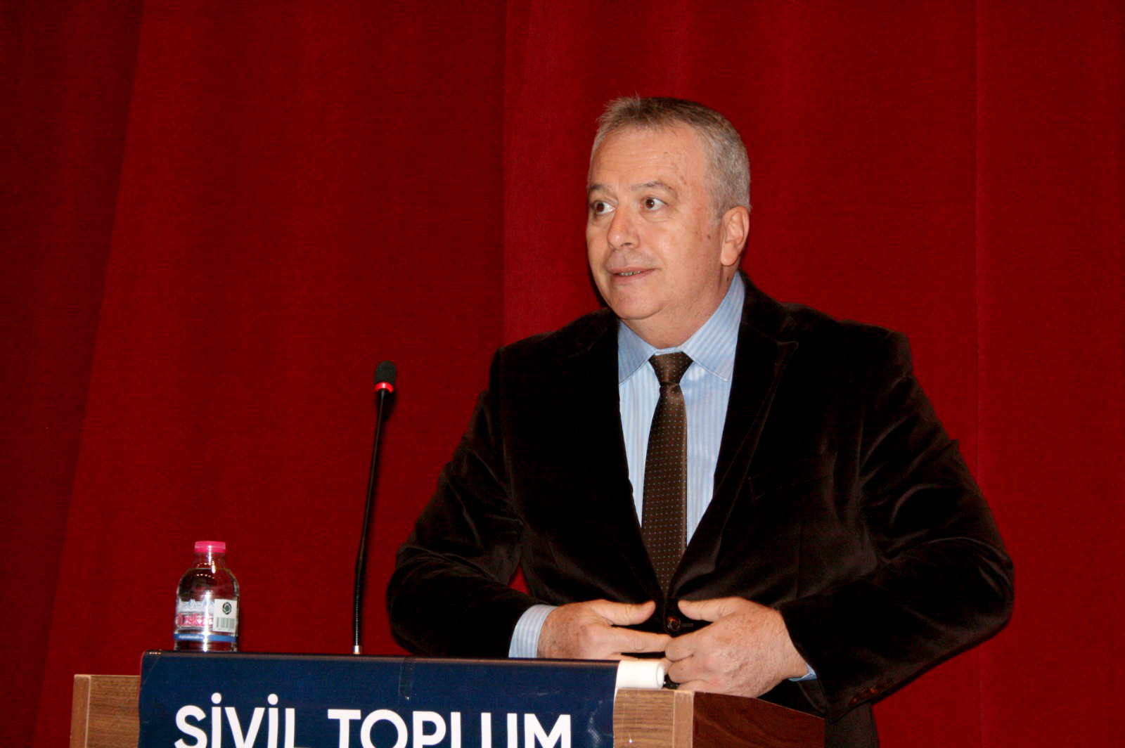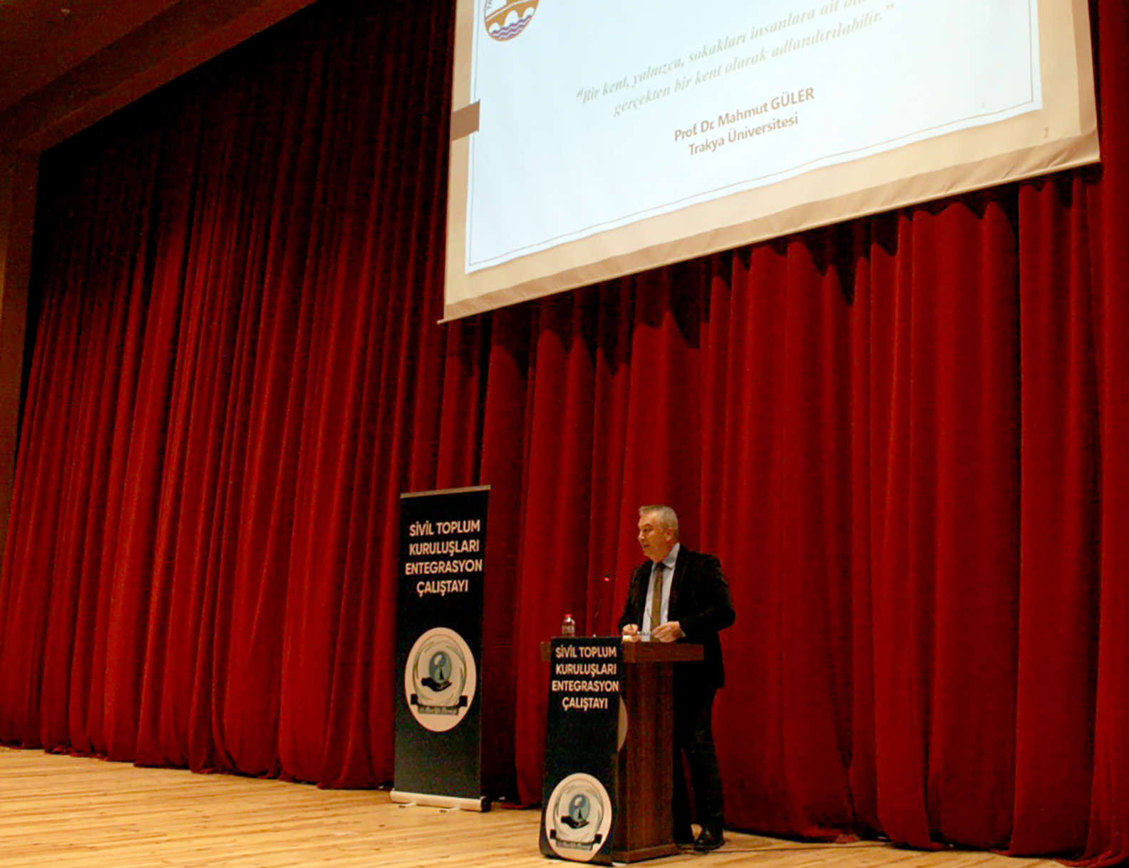 Tomris Gizem Çokgezer’in konuşmasının ardından Trakya Üniversitesi’nden Prof. Dr. Mahmut Güler tarafından ‘kentleşme ve sivil toplum’ konulu sunum gerçekleştirildi. Sunumunun başında salonda kent protokolünden kimsenin bulunmadığına dikkat çeken Prof. Dr. Güler; “Bu toplantı ve bu sunum benim için çok rahat olacak. Çünkü dostlarımın, öğrencilerimin, meslektaşlarımın arasındayım. Protokolün olmamış olması bizim için avantaj. Çünkü protokolün olduğu yerlerde çok rahat konuşma imkanı bulamayabiliyoruz. Biz bize daha rahat ve daha geniş bir perspektifle, konuları tartışmak değer kazanacaktır” şeklinde konuştu.