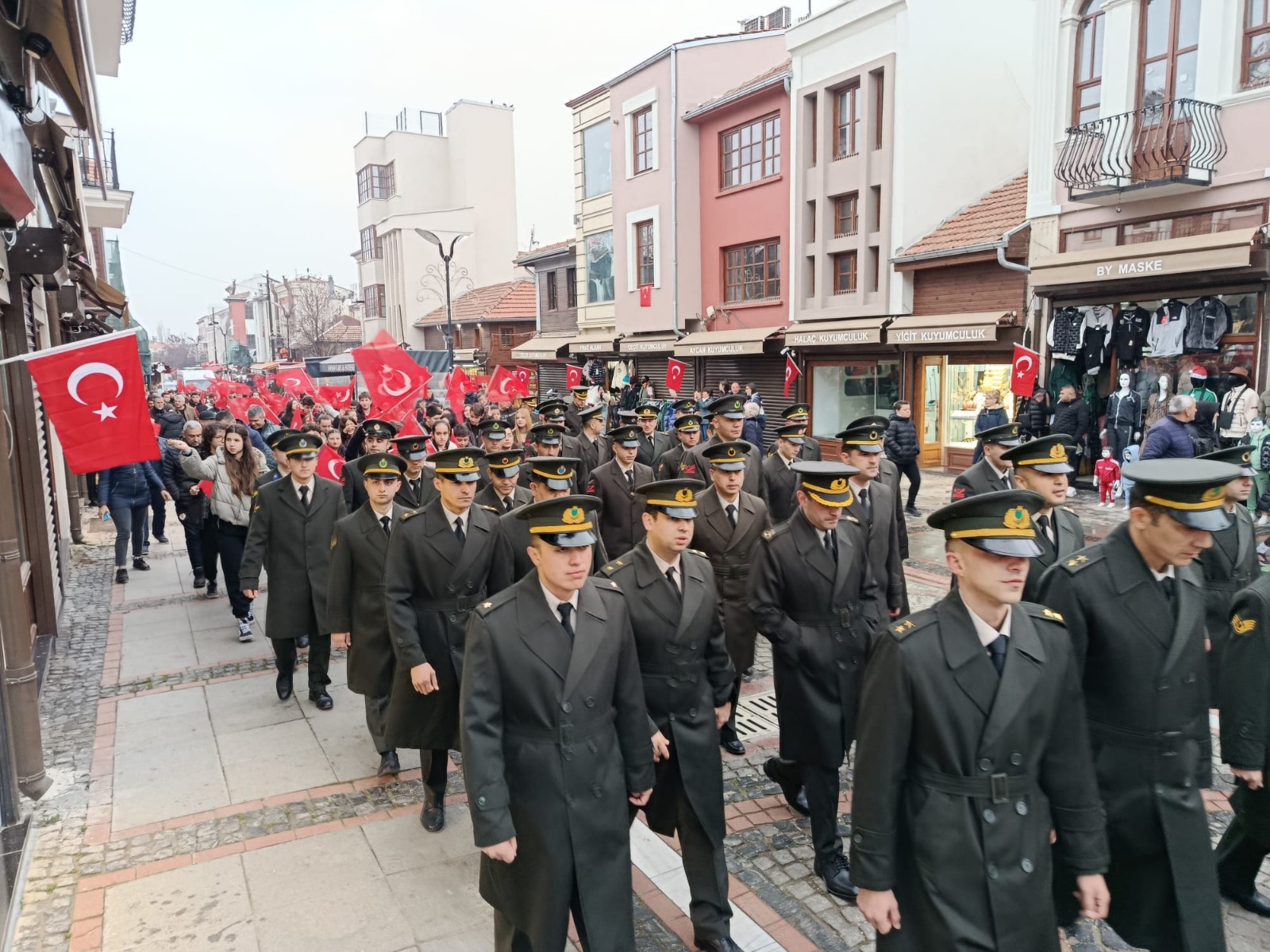Atatürk Anıtı’na çelenk sunulan törenin ardından kortej eşliğinde Edirne Belediyesi’ne yürüyüş yapıldı.