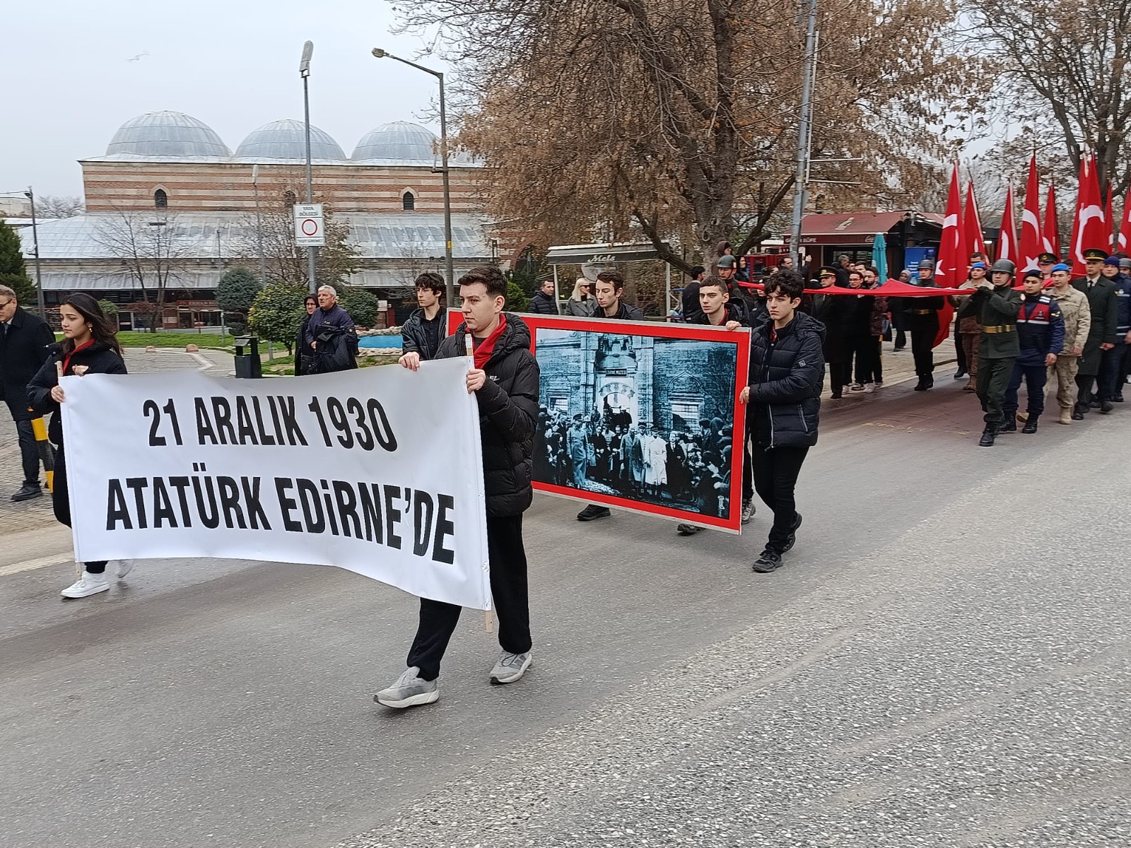 Atatürk’ün Edirne’ye gelişinin 95’inci yıldönümü kutlamaları kapsamında, İnönü İlkokulu önünde oluşturulan kortej, Saraçlar Caddesi’nden, kent merkezindeki Atatürk Anıtı’na yürüdü. Kortej yürüyüşüne; Edirne Valisi Yunus Sezer, Edirne Belediye Başkanı Filiz Gencan, kamu kurum ve kuruluş ile sivil toplum örgütü temsilcileri katıldı.