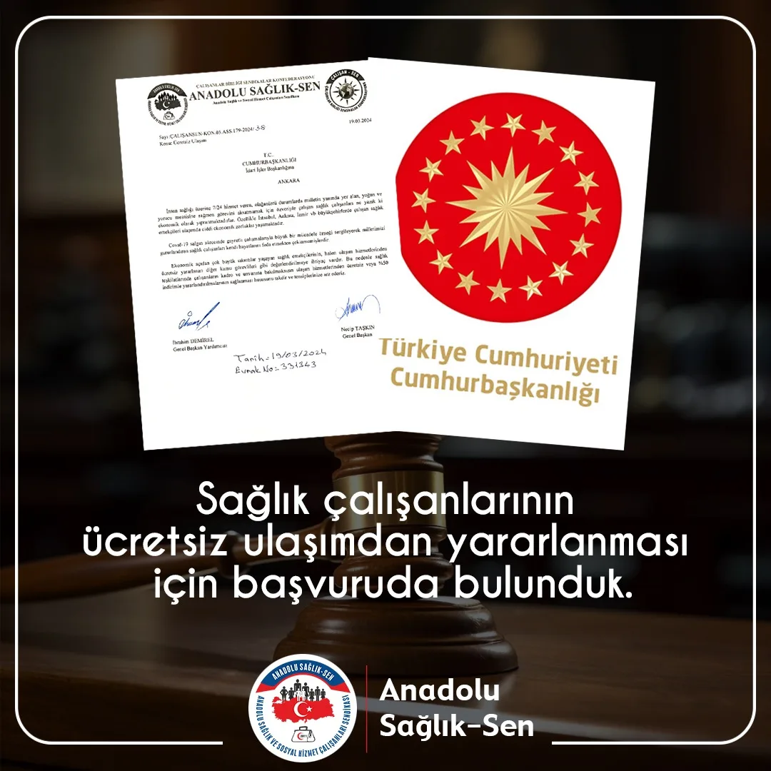 Anadolu Sağlık Sen, özveriyle görev yapan sağlık çalışanlarının ulaşımdan ücretsiz yararlanması için başvuruda bulundu.
