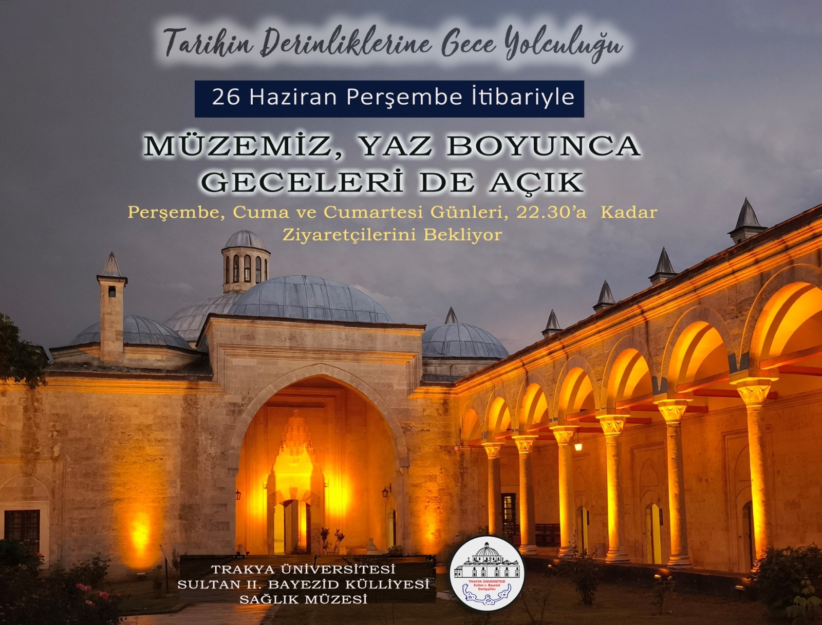 Trakya Üniversitesi Sultan II. Bayezid Külliyesi Sağlık Müzesi 26 Haziran Perşembe akşamı itibariyle haftanın 3 günü geceleri de ziyaretçilerine açık olacak. Kültür ve Turizm Bakanlığı’nın başlattığı “Gece Müzeciliği” uygulaması, ülkemizin farklı şehirlerinde bakanlığa bağlı önemli müzelerde hayata geçirilirken, Edirne’de de Sağlık Müzesi bu uygulamanın öncüsü oldu.