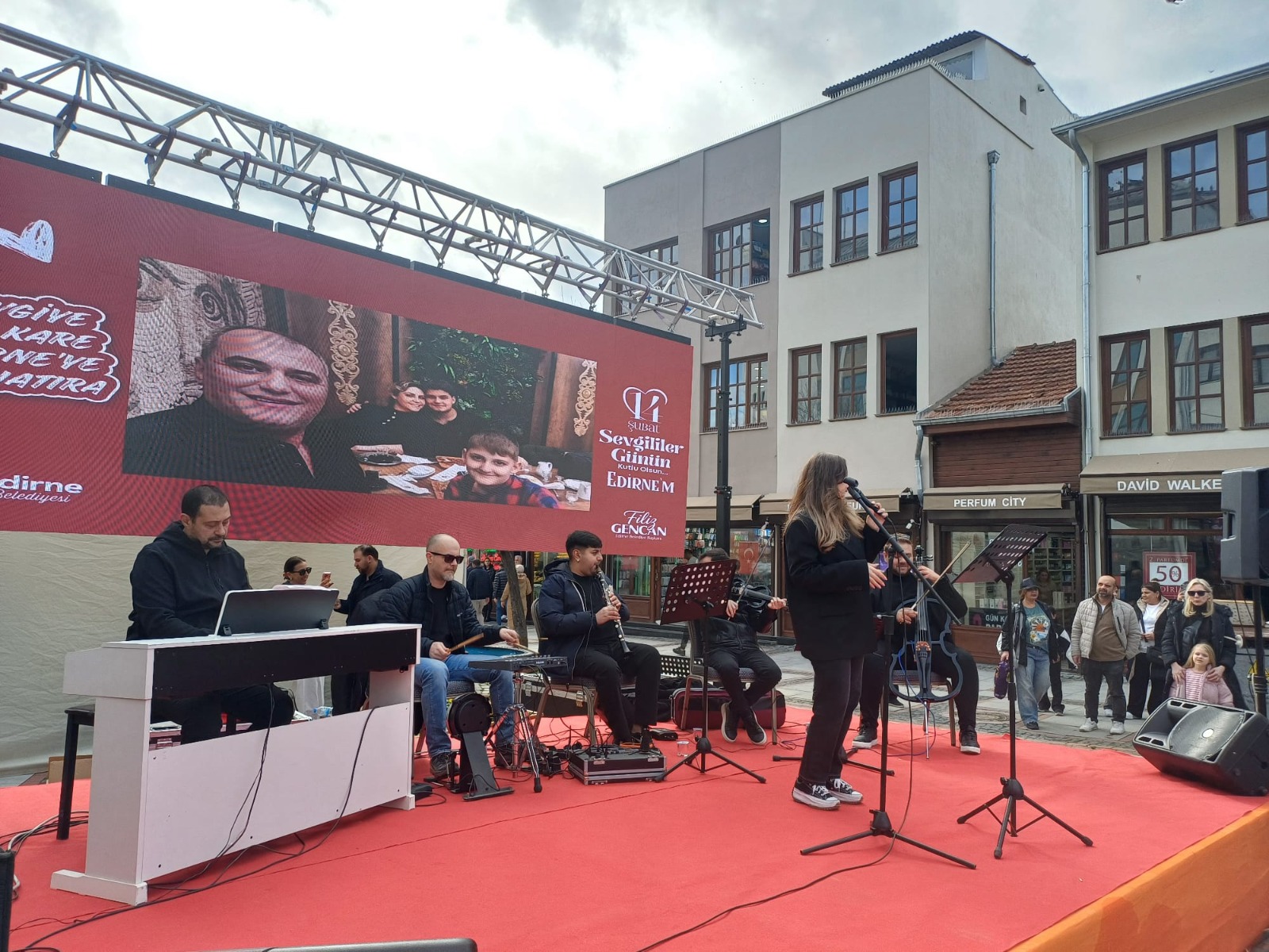 Edirne’de Sevgililer Günü’nde, 7’den 70’e çiftlerin buluşma adresi, Edirne Belediyesi’nin düzenlediği organizasyonla, Saraçlar Caddesi oldu…Etkinlikte, çiftlerin çekildiği fotoğraflar anlık LED ekrana yansıtılırken, Edirne Belediyesi Kent Orkestrası konseri ve dans topluluğu gösterisi vatandaşlarla buluştu…