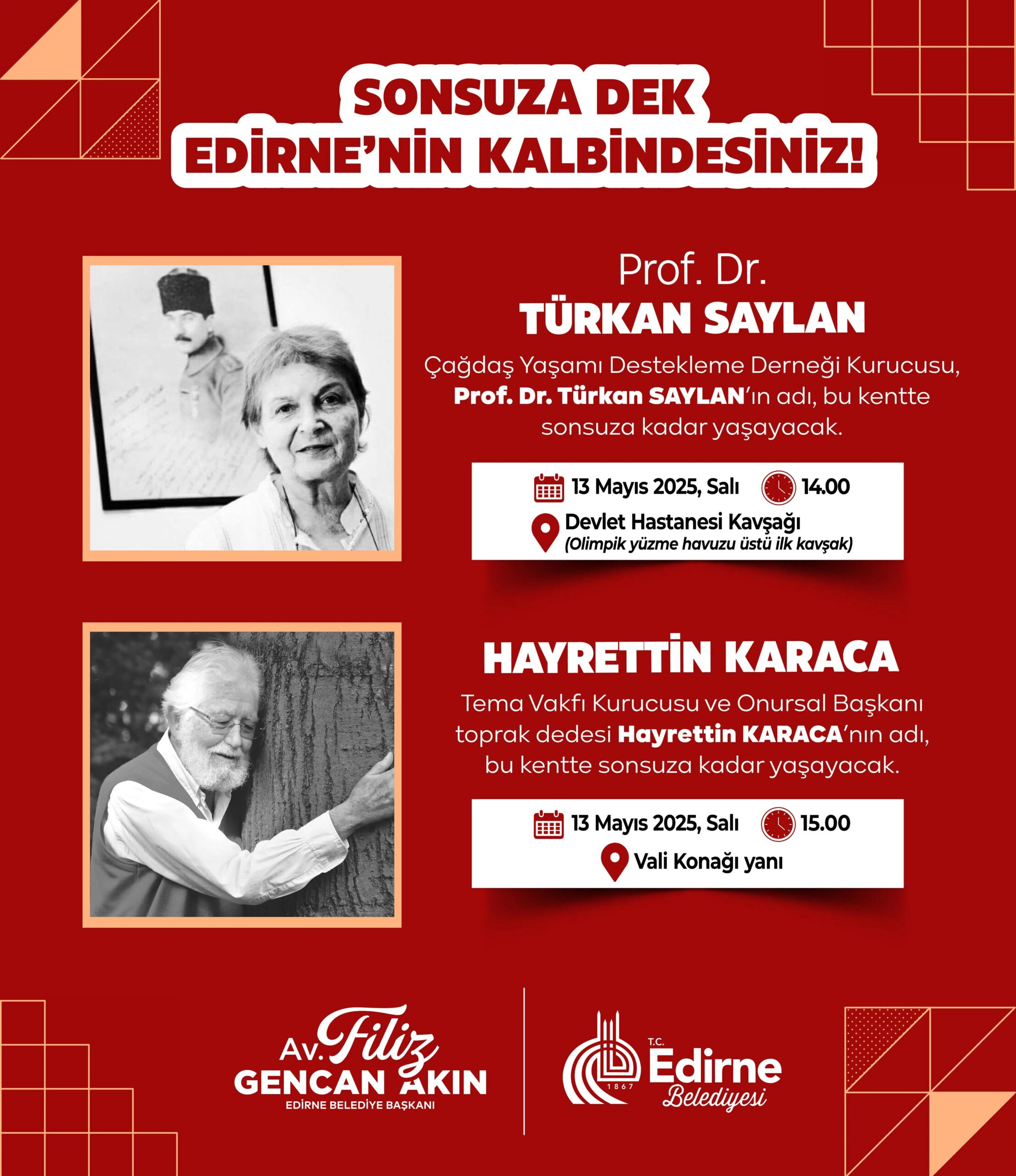 Edirne Belediyesi, Cumhuriyet değerlerine ve toplumsal duyarlılığa katkı sunmuş iki önemli ismin adını kentte yaşatmak üzere anlamlı bir adım attı. Türk tıbbının ve eğitiminin öncü ismi, Çağdaş Yaşamı Destekleme Derneği kurucusu Prof. Dr. Türkan Saylan ile doğaya adanmış bir ömrün simgesi olan TEMA Vakfı Kurucusu Hayrettin Karaca’nın isimleri Edirne’de belirlenen alanlara verilecek.