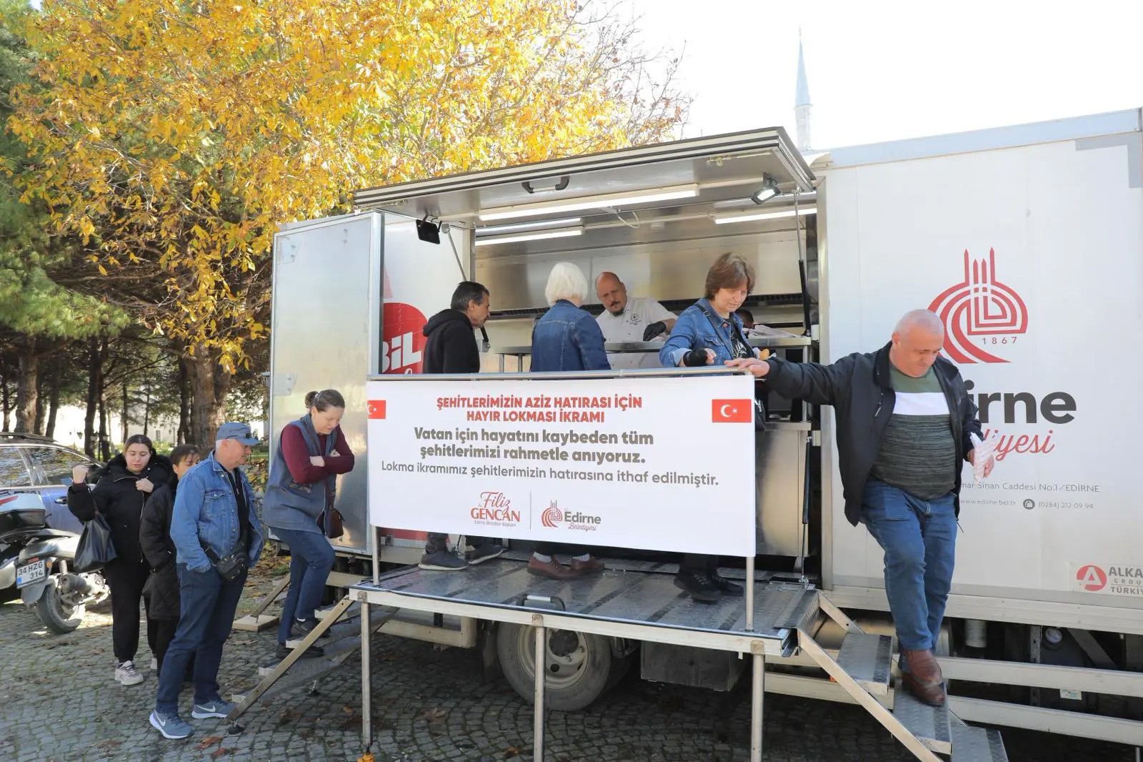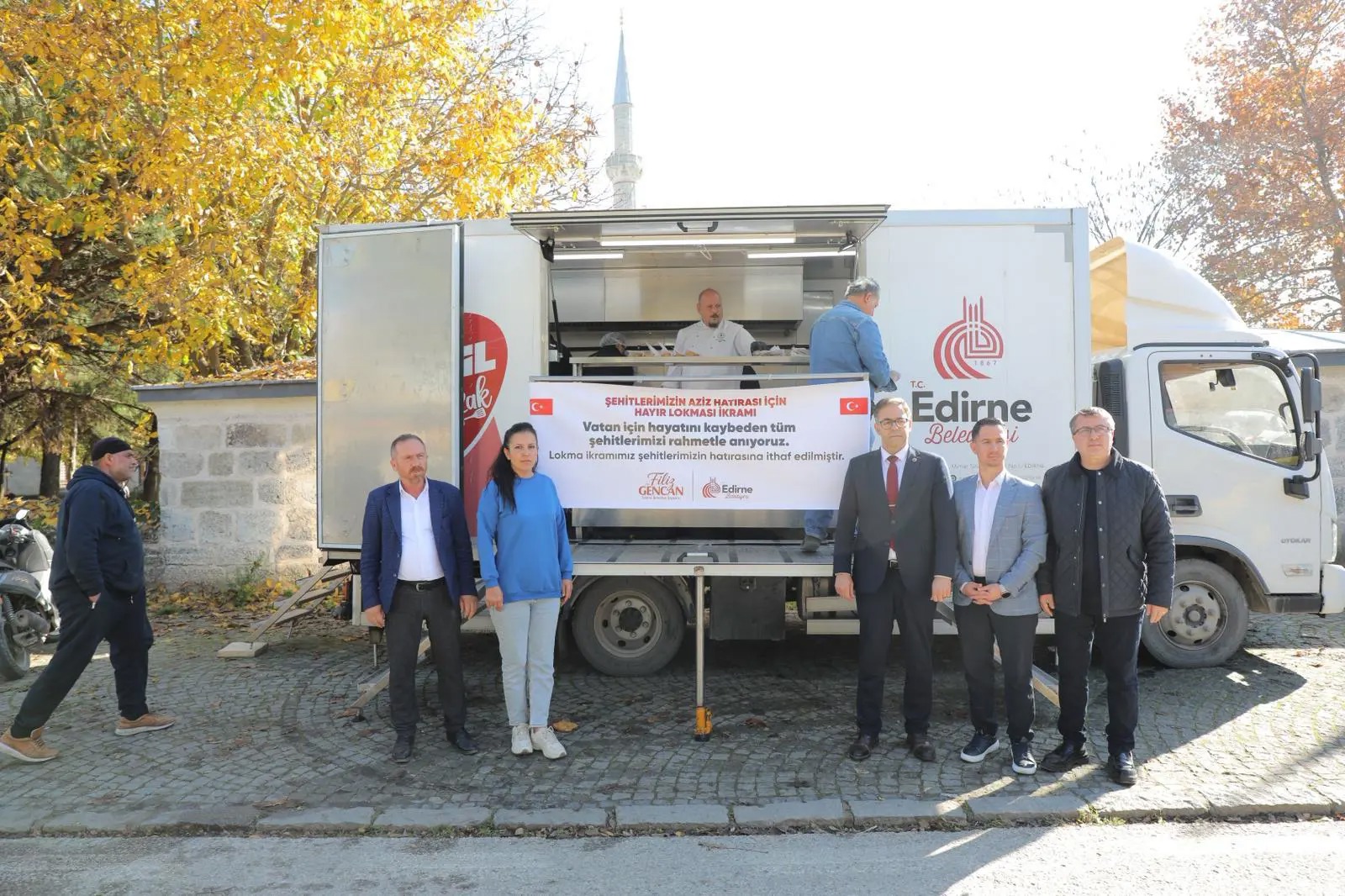 Lokma ikramı sırasında duygularını dile getiren Başkan Yardımcısı Cenk Ergüden, “Vatanı için canını ortaya koyan tüm şehitlerimiz milletimizin kalbinde yaşayacaktır. Onların aziz hatırası bizlerde varlığını sürdürmektedir. Bugün burada ikram ettiğimiz hayır lokması, şehitlerimizin kutlu hatırasına armağan edilmiştir. Belediye Başkanımız Sayın Filiz Gencan, Edirne Şehit Aileleri Derneği Başkanımız Leyla Vardar Karaduman ile birlikte düzenlenen şehit cenazesine katılarak şehidimizin yakınlarına Edirne halkı olarak taziyelerini iletmek üzere şu anda Lüleburgaz’da bulunuyor.” ifadelerini kullandı.