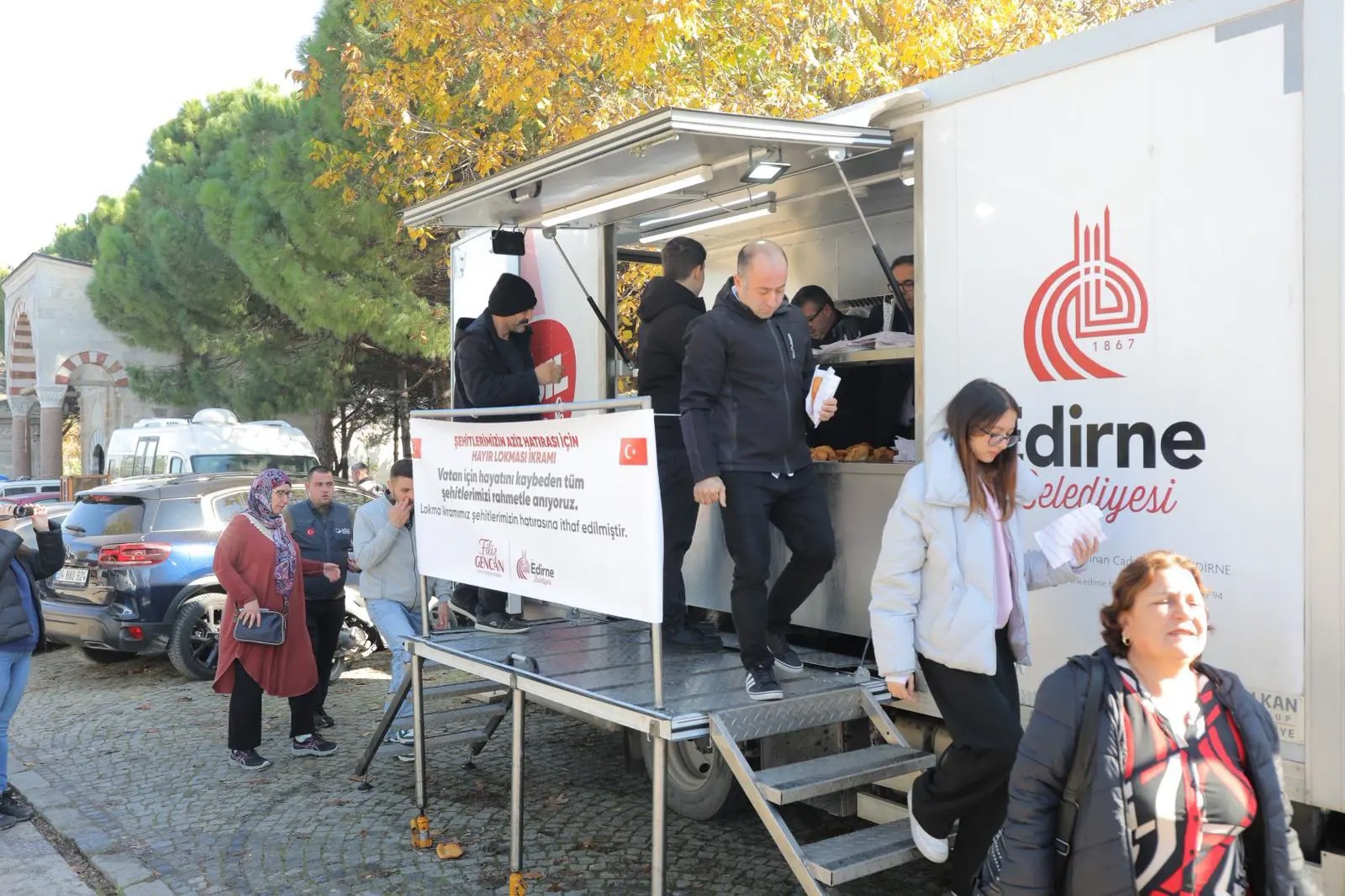 Edirne Belediyesi’nin her hafta Cuma günleri gerçekleştirdiği geleneksel hayır lokması ikramı, bu hafta vatan görevini yaparken şehit olan kahramanların aziz hatırasına ithaf edildi. Belediye Başkan Yardımcısı Cenk Ergüden ve Meclis Üyeleri, anma programında vatandaşlarla bir araya geldi.