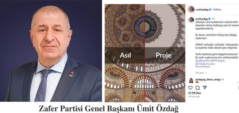 Zafer Partisi Genel Başkanı Ümit Özdağ, UNESCO Dünya Kültür Mirası Listesi’nde yer alan Mimar Sinan’ın başyapıtı Selimiye Camii’nin kubbesindeki tartışmalara yol açan restorasyon çalışmalarına “Tarihi keyfinize göre değiştiremezsiniz! Bu tarih soykırımına izin verilmemelidir” diyerek tepki gösterirken, bir süre önce aynı konudaki eleştirilerini dile getiren ünlü tarihçi İlber Ortaylı, sosyal medya hesabından bu tavrını bir kez daha ortaya koydu.