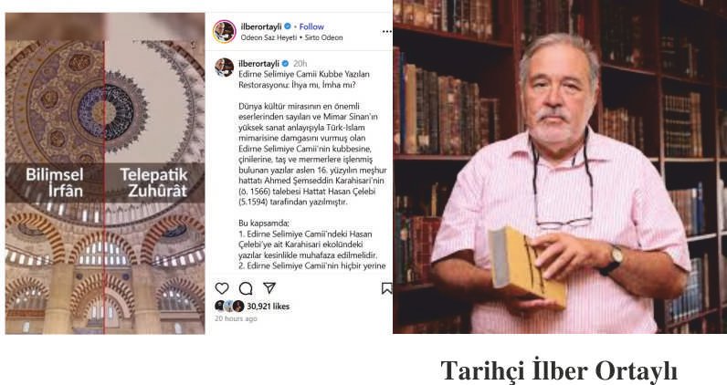 Selimiye Camii’nin kubbesinde yürütülen restorasyon çalışmalarına bir süre önce tepki gösteren ünlü tarihçi İlber Ortaylı, bunu uzman hattatların ortak bildirisinden yola çıkarak ikinci kez şöyle yineledi:
