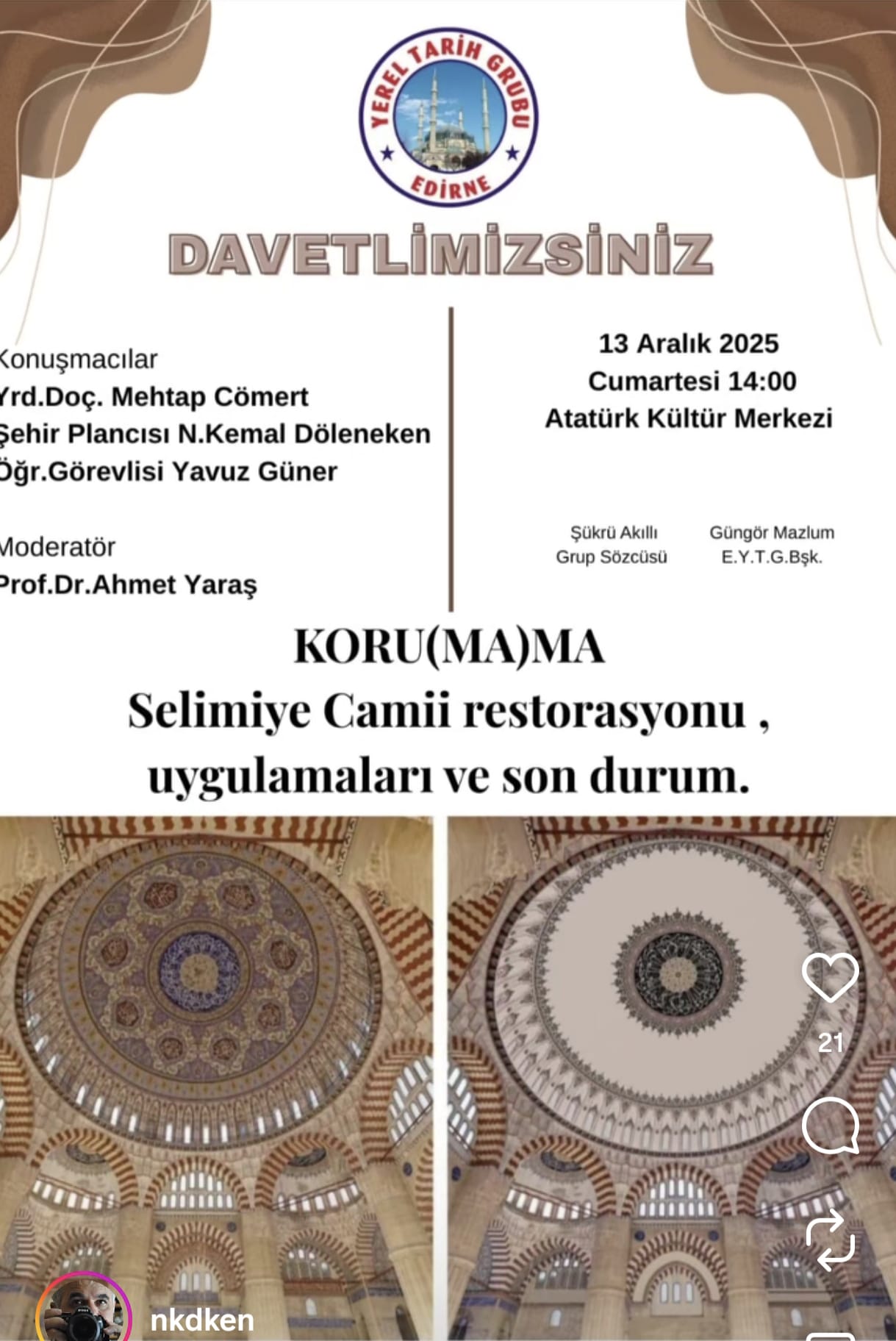 Edirne Yerel Tarih Grubu’nca düzenlenen “Selimiye Camii Resterasyonu, Uygulamaları ve Son Durum – KORU(MA)MA” konulu panel Edirne Belediyesi Atatürk Kültür Merkezi’nde saat 14.00’t gerçekleştirilecek. Prof. Dr. Ahmet Yaraş’ın moderatörlüğündeki panele Yrd. Doç. Mehtap Cömert, Şehir Plancısı Namık Kemal Döleneken ve Öğretim Görevlisi Yavuz Güner konuşmacı olarak katılacak.