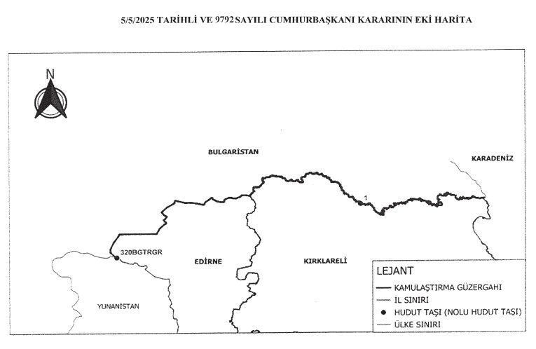 “Edirne ve Kırklareli illerinin Bulgaristan hudut hattında tesis edilecek devriye yolu, fiziki engel sistemleri, aydınlatma sistemleri, teknolojik gözetleme sistemleri ve sınır güvenliğinin sağlanmasına yönelik benzeri işler kapsamında ekli haritada gösterilen güzergâha isabet eden taşınmazlar ile bu kapsamda inşa edilecek bağlantı yolları, enerji nakil hatları ve bazı tesislerin yapımı amacıyla ihtiyaç duyulan taşınmazların Edirne Valiliği ile Kırklareli Valiliği tarafından acele kamulaştırılmasına, 2942 sayılı Kamulaştırma Kanununun 27 nci maddesi gereğince karar verilmiştir.”