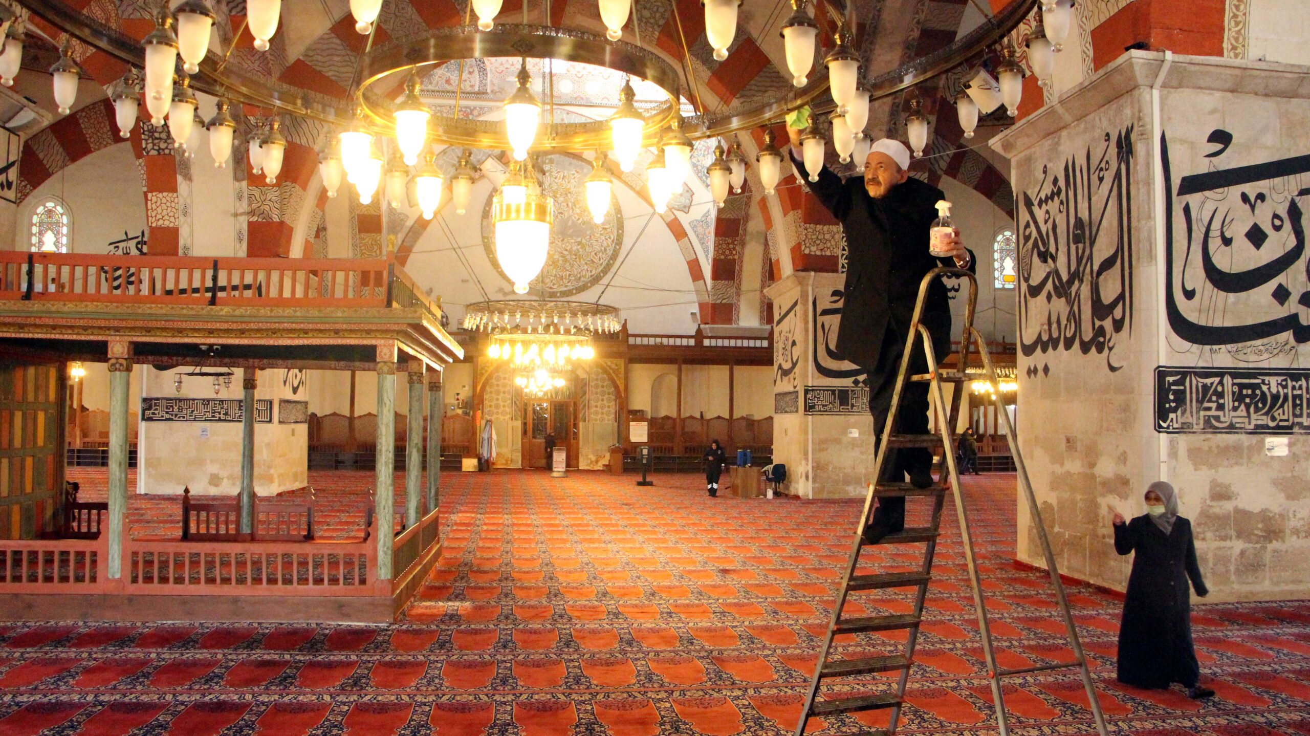 Edirne’de başta tarihi camiler olmak üzere tüm camiler ramazan ayına hazırlanıyor. Tarihi Eski Cami’nin avizeleri, ahşap döşemeleri gül suyuyla temizlendi. Fotoğraf: Umut IŞIK/Edirne, (DHA)