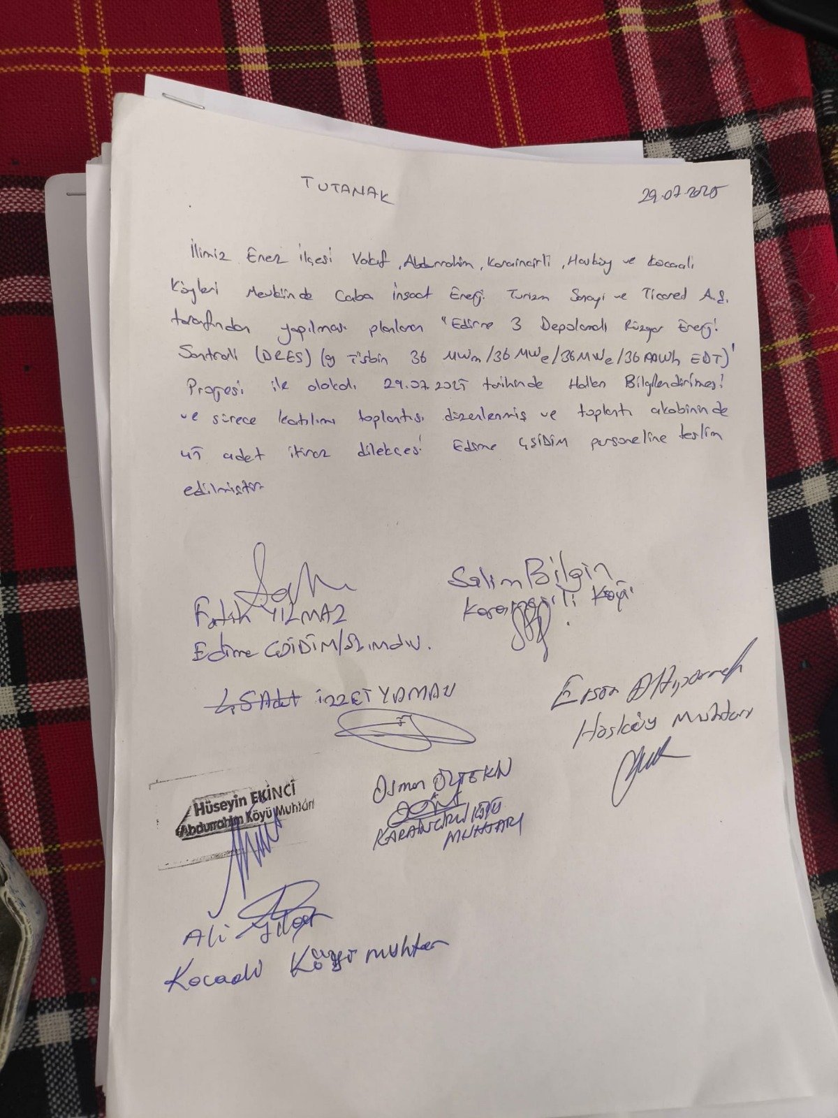 Enez ilçesi, Vakıf, Abdurrahim, Karaincirli, Hasköy, Kocaali köyleri mevkiinde Caba İnşaat Enerji Turizm Sanayi ve Ticaret A.Ş. tarafından yapılması planlanan “Edirne 3 Depolamalı Rüzgâr Enerji Santrali (DRES) (9 Türbin 36 MWm/36 MWe-36 MWe/36 MWh EDT)” projesi ile alakalı 29.07.2025 tarihinde halkın bilgilendirilmesi ve sürece katılım belgesi düzenlenmiş ve toplantı akabinde 45 adet itiraz dilekçesi Çevre, Şehircilik ve İklim Değişikliği İl Müdürlüğü personeline teslim edilmiştir.”