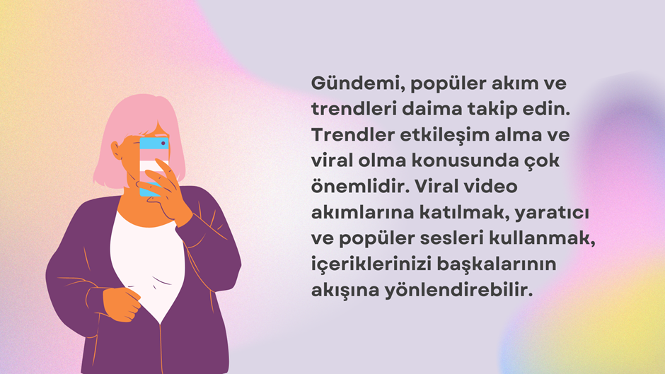 Gündemi, popüler akım ve trendleri daima takip edin. Trendler etkileşim alma ve viral olma konusunda çok önemlidir. Viral video akımlarına katılmak, yaratıcı ve popüler sesleri kullanmak, içeriklerinizi başkalarının akışına yönlendirebilir. Birçok farklı kitleye erişim sağlamış olursunuz.