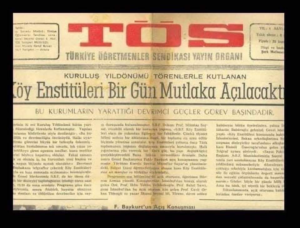 “Türkiye Öğretmenler Sendikası (TÖS), 8 Temmuz 1965 tarihinde kurulmuş, 1971 yılında gerçekleştirilen 12 Mart Darbesi sonucunda yapılan Anayasa değişikliği ile kapatılmıştır. Türkiye’nin ilk öğretmen sendikası TÖS’ün, Demokratik kitle örgütlenmesinde 70’li yıllardaki önderlerimiz Fakir Baykurt ve Muammer Aksoy kitlesel bir devrimci öğretmen hareketini yaratabilmişlerdir.