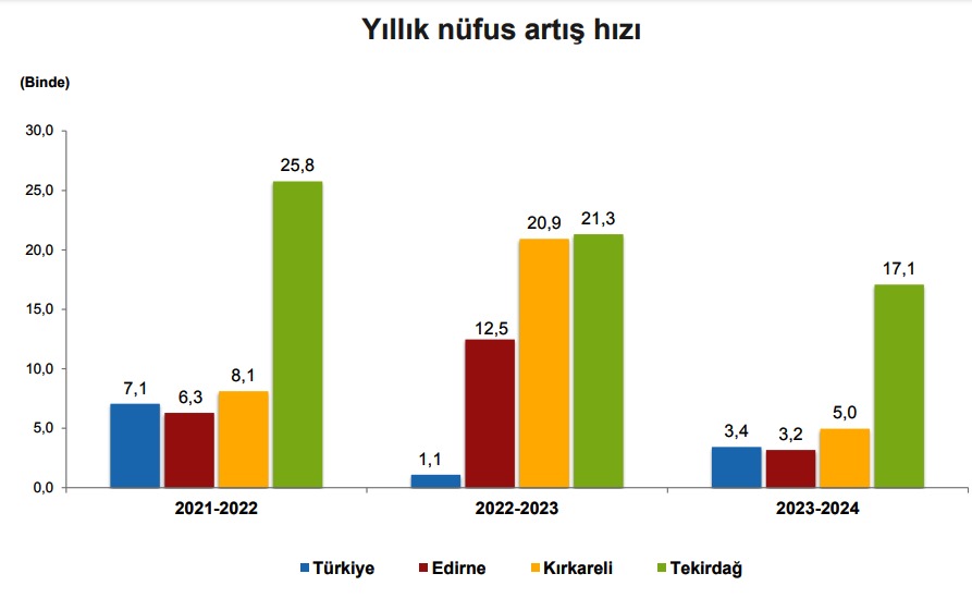 2024 yılı itibarıyla Edirne’nin nüfusu 421 bin, Kırklareli’nin 379 bin, Tekirdağ’ın ise 1 milyon 187 bin olarak kaydedildi. 2023-2024 döneminde Türkiye genelinde yıllık nüfus artış hızı binde 3,4 olurken, Edirne binde 3,2, Kırklareli binde 5,0, Tekirdağ ise binde 17,1 oranında artış gösterdi.