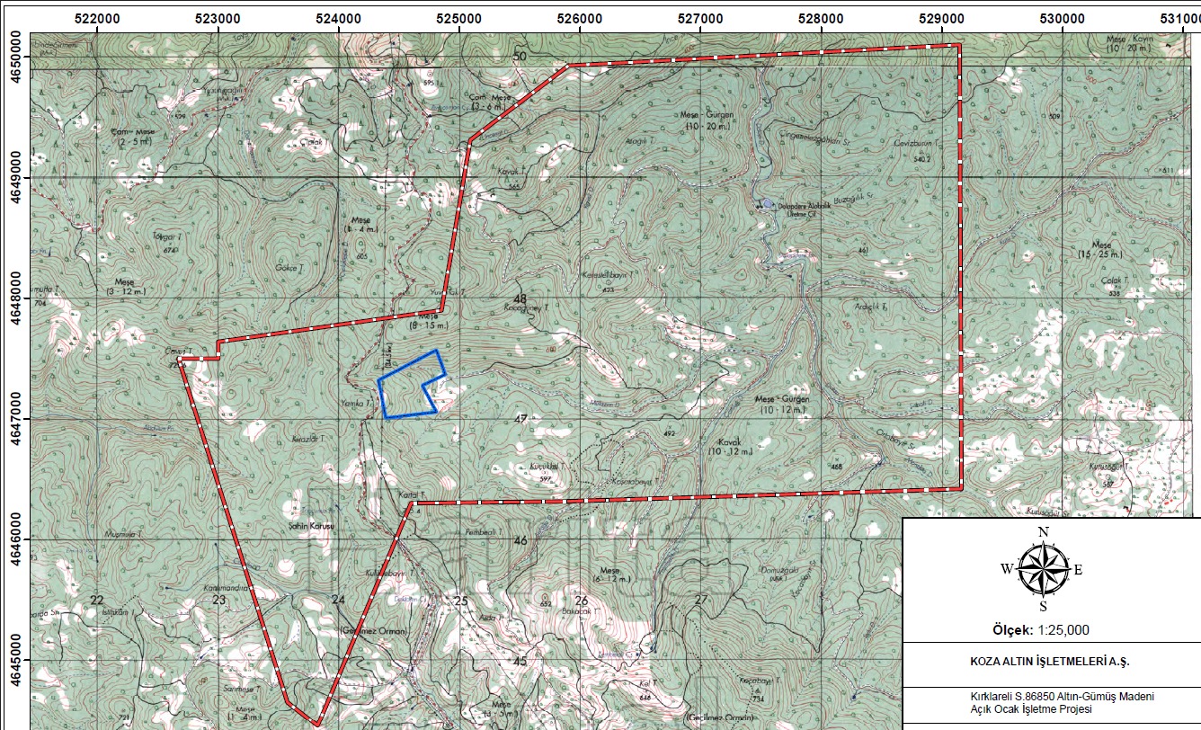 Bölgedeki ekosistemin tahrip edilmesi ve binlerce ağacın kesilmesinin öngörüldüğü proje kapsamında şirketin izin aldığı alanın ise büyüklüğü, ÇED raporuna gerek duyulmaması için (25 hektar ve üzeri için ÇED raporu gerekli tutuluyor) 18,2 hektarla sınırlı tutulmuş durumda. Projede bir yılda 310 bin 481 ton malzeme çıkartılması planlanıyor. Bunun 123 bin 750 tonunun cevher olması beklenirken 186 bin 731 tonunun ise atık, yani pasa olacağı belirtiliyor.