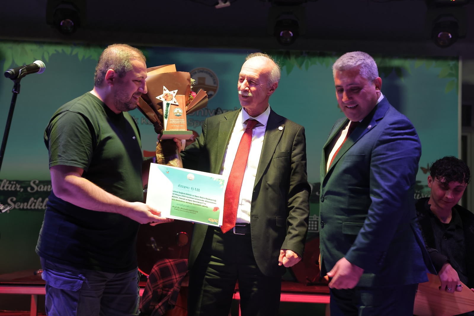 Trakya Üniversitesi Rektörü Prof. Dr. Mustafa Hatipler şenlik alanını ziyaret ederek öğrenciler ve sanatçılarla bir araya geldi. Emre Çam’ın teşekkür belgesini veren Rektör Hatipler, sanatçımızı kutlayarak şenlik programının başarılı geçmesi dileğinde bulundu.