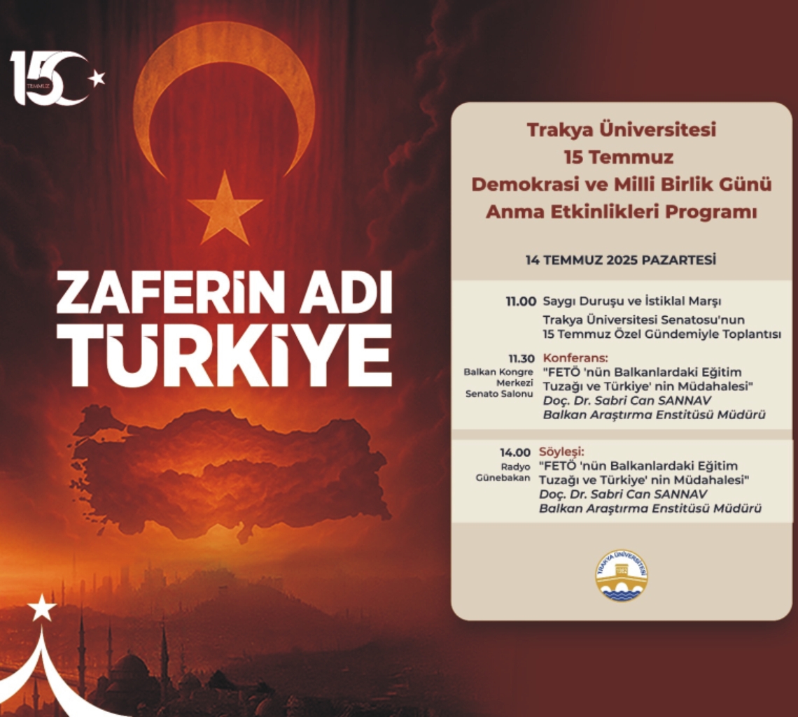 Trakya Üniversitesi’nce 15 Temmuz Demokrasi ve Milli Birlik Günü Anma Etkinlikleri kapsamında 14 Temmuz 2025 Pazartesi günü “Zaferin Adı Türkiye” başlığı altında özel program gerçekleştirilecek.