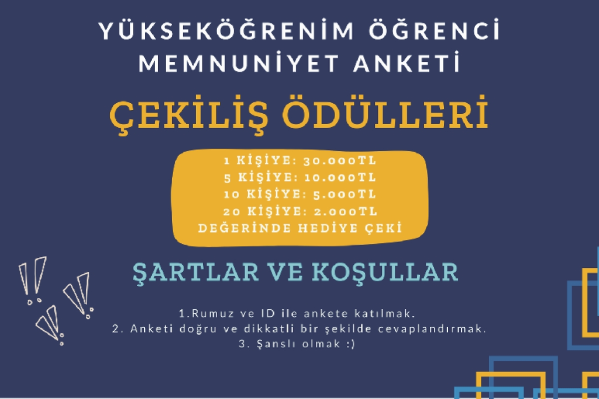 Çekilişin sonunda ödül kazanmasanız bile, yanıtlarınız ve görüşleriniz bizim için büyük önem taşımaktadır. Anketin sonunda, yükseköğrenim deneyiminiz hakkında paylaşmak istediğiniz düşünceleri, sorunlu gördüğünüz alanları ya da ankete dair fikirlerinizi yazabileceğiniz iki açık uçlu soru bulunmaktadır. Sizlerin geri bildirimleri, eğitim ve öğretim ortamının gelişimi için kritik bir rol oynamaktadır.