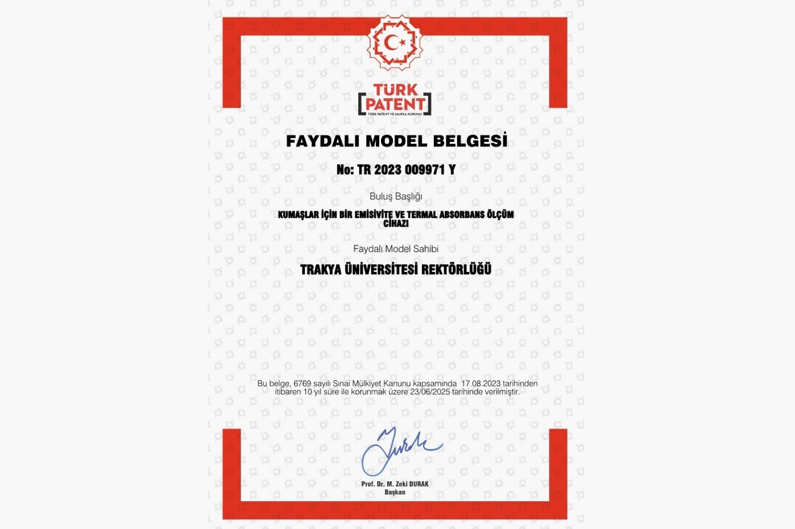 Trakya Üniversitesi Edirne Teknik Bilimler Meslek Yüksekokulu Dr. Öğr. Üyesi İsmail Yüce tarafından geliştirilen “Kumaşlar İçin Bir Emisivite ve Termal Absorbans Ölçüm Cihazı” başlıklı buluş, Türk Patent ve Marka Kurumu tarafından faydalı model belgesi almaya hak kazandı.
