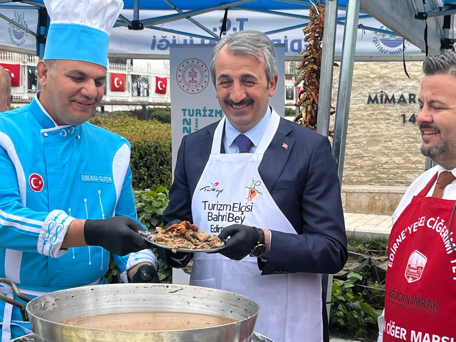 Vali Sezer, turizm haftasını buruk kutladıklarını belirterek, “Bugün buruk bir günümüz. Maalesef evlatlarımızı kaybettik. Hem Urfa’da, hem de Maraş’ta, malumlarınız bütün milletimizi hüzne boğan evlatlarımızı kaybettiğimiz elim olayla karşı karşıyayız. Onun için bir tarafımız gerçekten çok buruk. Allah’tan rahmet diliyoruz evlatlarımıza. Bir taraftan da bu hafta Turizm Haftası. Edirne’miz biliyorsunuz turizm şehri. 2 sene önce yine burada rahmetli Bahri beyle beraber yukarıda çok güzel bir etkinlik yapmıştık fakat onu da hiç beklemediğimiz anda kaybettik. O Edirne’nin gülen yüzüydü, turizm elçisiydi. Allah’tan rahmet diliyoruz kendisine. Bir taraftan da geride kalan ve Edirne’nin turizm şehri olmasına, değerlerin tanıtılmasına kendini adayan başta diğer tava ciğer ustalarımız olmak üzere Allah’tan onlara da sağlık diliyoruz. Hep beraber el ele, gönül gönüle, Edirne’mizin başta tava ciğer olmak üzere özel ve güzel ürünlerini, turizm değerlerini inşallah bu haftaları da vesile kılarak tanıtmaya devam edeceğiz” diye konuştu.