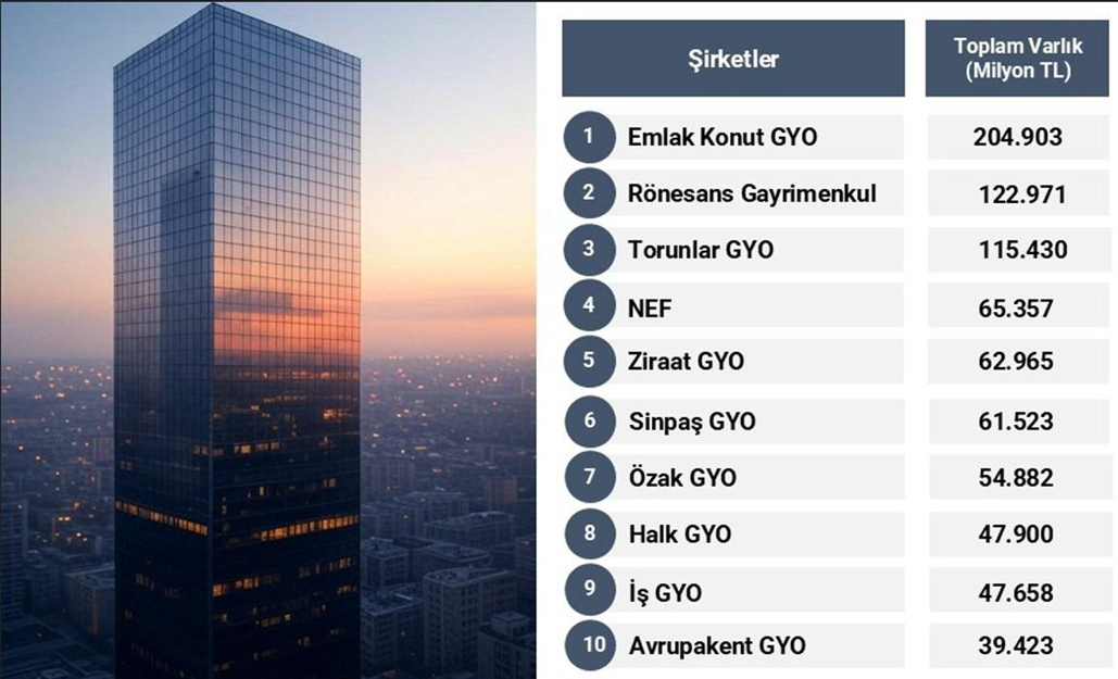 Emlak Konut GYO varlık büyüklüğüyle liderliğini sürdürürken, Rönesans ve Torunlar GYO geniş alışveriş merkezi portföyleriyle, Nef ise Marmara ve Ege’deki geniş arsa stoğuyla öne çıktı.