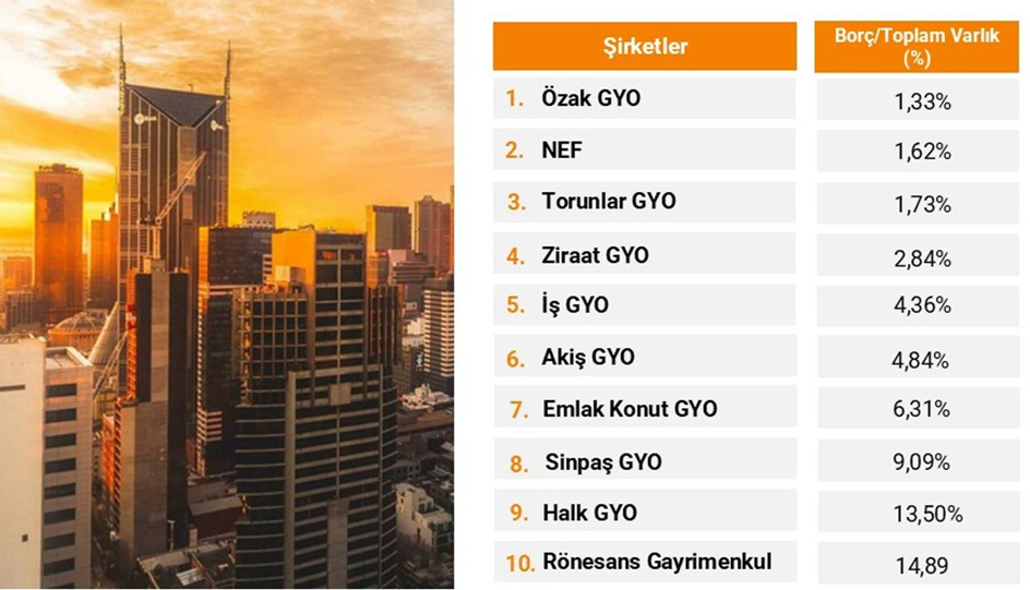 Borçların toplam varlıklar içindeki payının en düşük olduğu şirket ise %1,33 ile Özak GYO oldu. Onu, %1,62 ile Nef, %1,73 ile Torunlar GYO izledi.