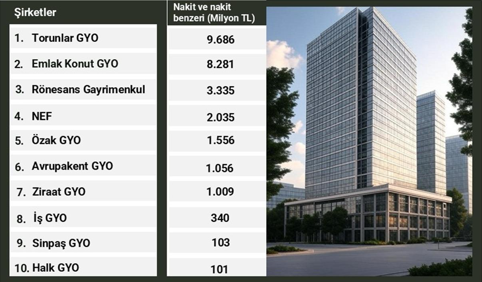Zorlu piyasa koşullarına rağmen güçlü nakit pozisyonunu koruyan şirketler de listelendi. En yüksek nakte sahip şirket, 9,7 milyar lira ile Torunlar GYO oldu. Emlak Konut GYO 8,3 milyar lira, Rönesans Gayrimenkul 3,3 milyar lira, NEF ise 2.035 milyar lira ile sıralamayı takip etti.