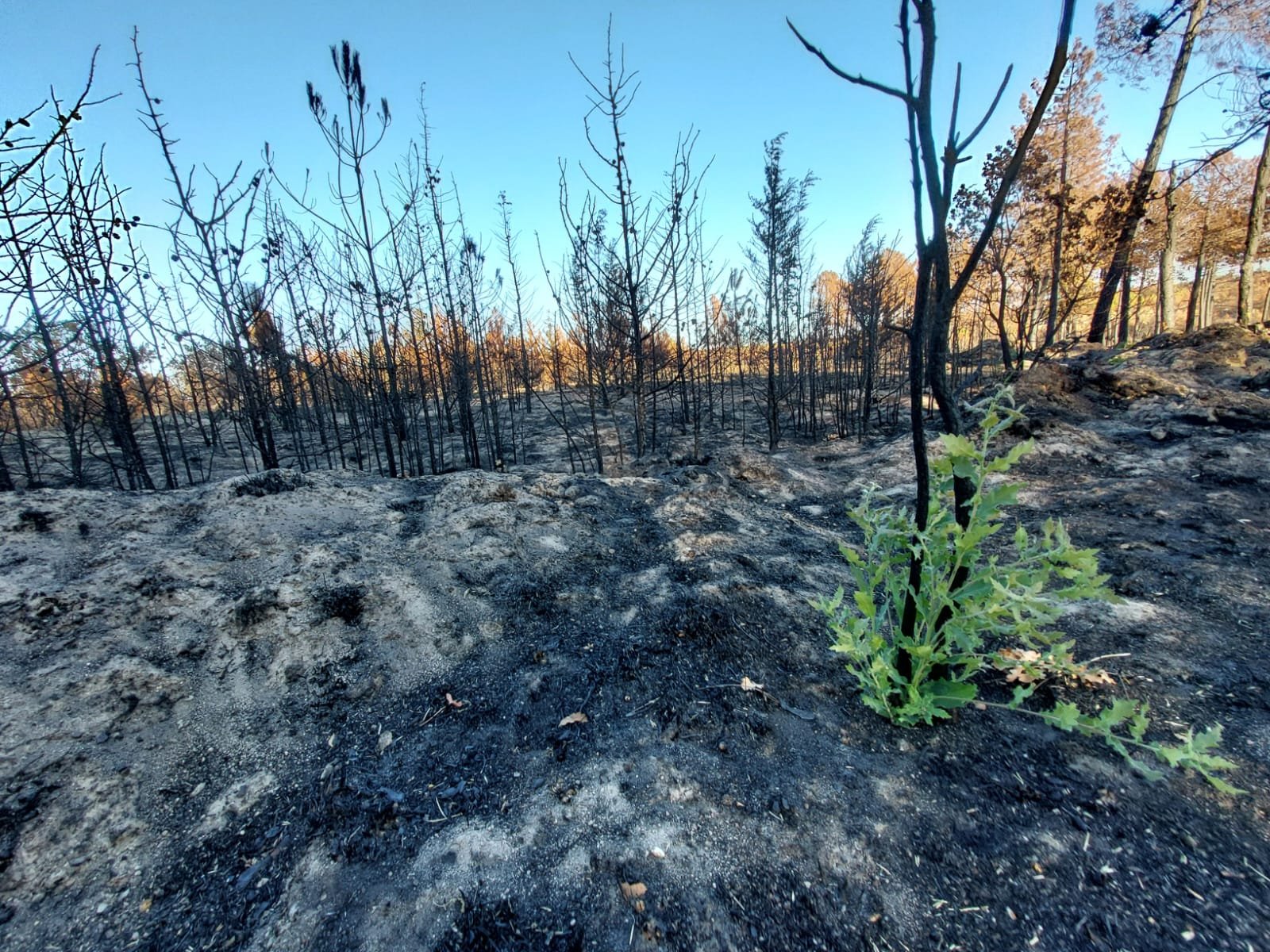 Fotoğrafta, kül olmuş çam fidanlarının arasında yeşermeye çalışan bir meşe fidesi görülüyor. Yanmış ağaçların gölgesinde yeniden hayat bulan bu küçük fidan, doğanın kendini onarma gücünü ve umudun hiç tükenmediğini hatırlatıyor.