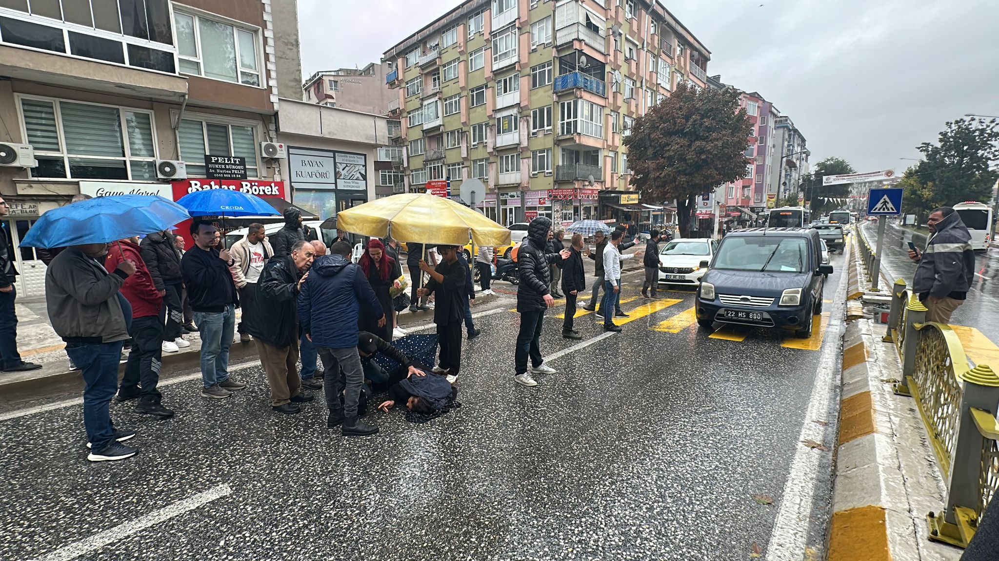 Edirne’de meydana gelen kazada Nurgül Çemberli (56), yaya geçidinde otomobilin çarpmasıyla yaralandı. Kuvvetli yağışın etkisini sürdürdüğü kentte, çevredeki esnaflar ambulans gelene kadar Çemberli’nin ıslanmaması için şemsiye açıp, üstüne mont örttü.